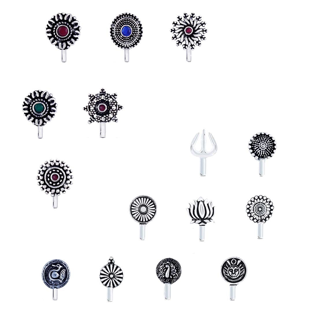 - Classic designs combo of 15 pcs festivals and celebrations are part of indian culture bollywood style oxidized silver Nosepin in contemporary design Non Piercing Nose pin with indian beauty and stylish look , goes on all occasion, with any outfit