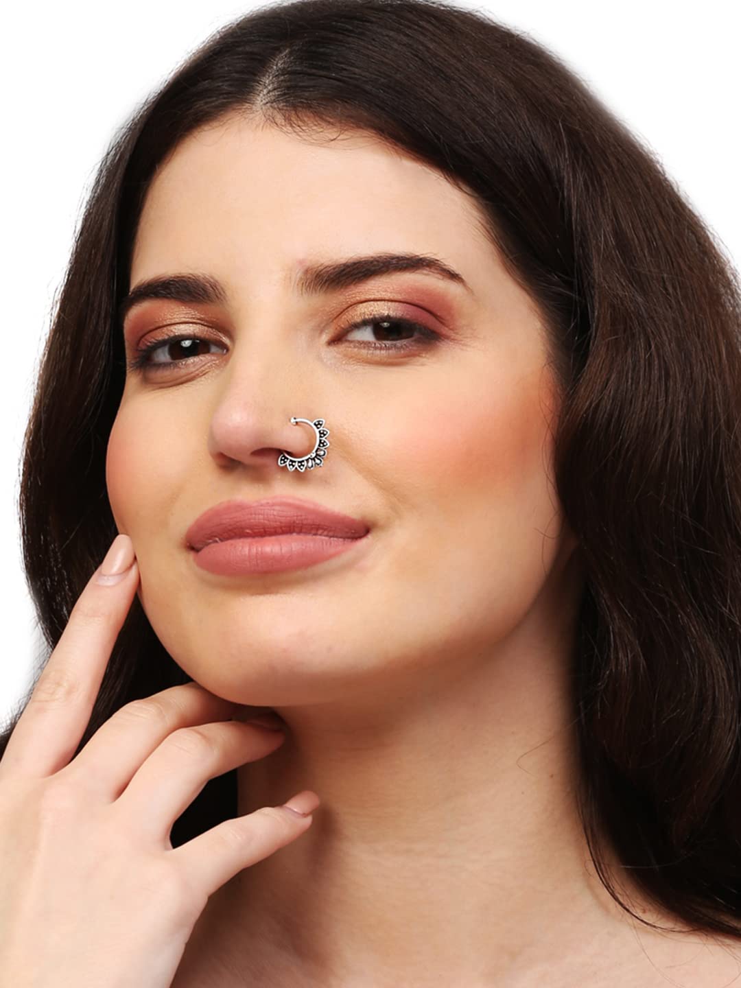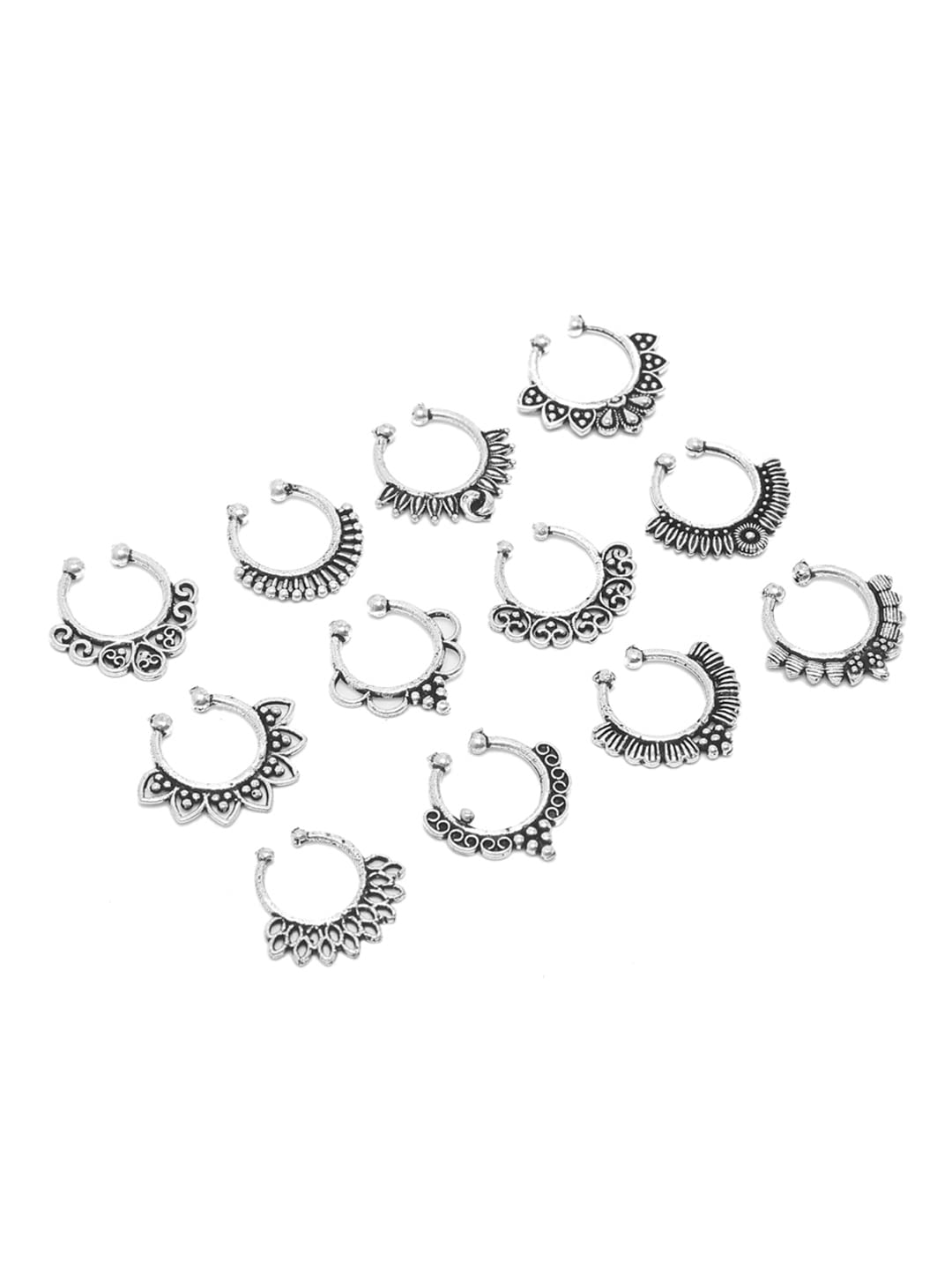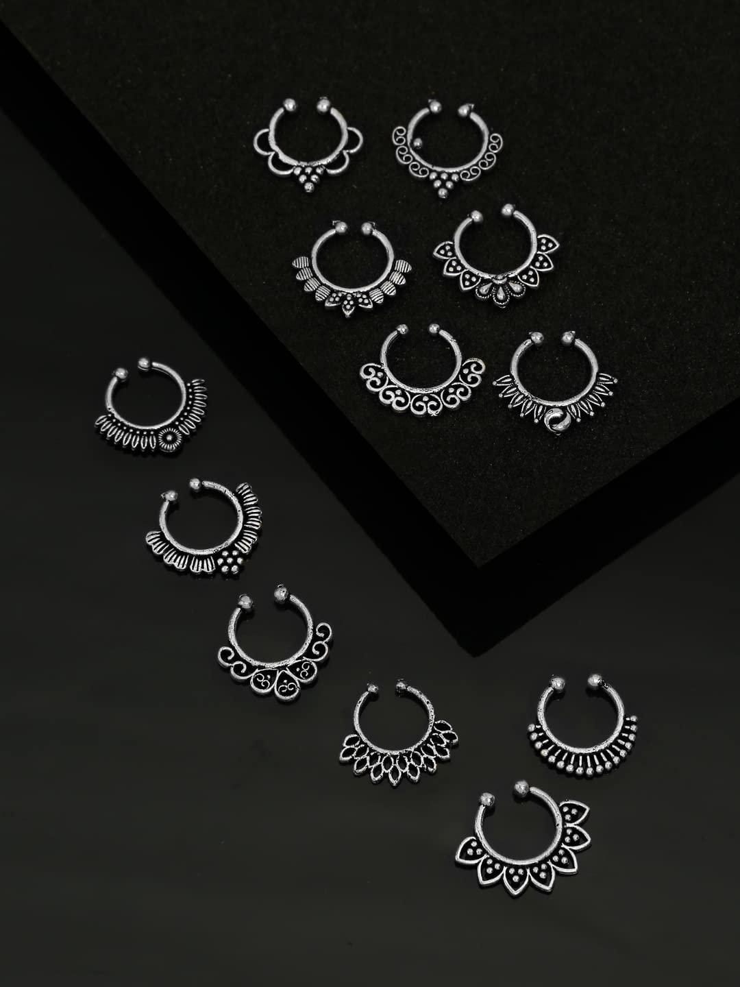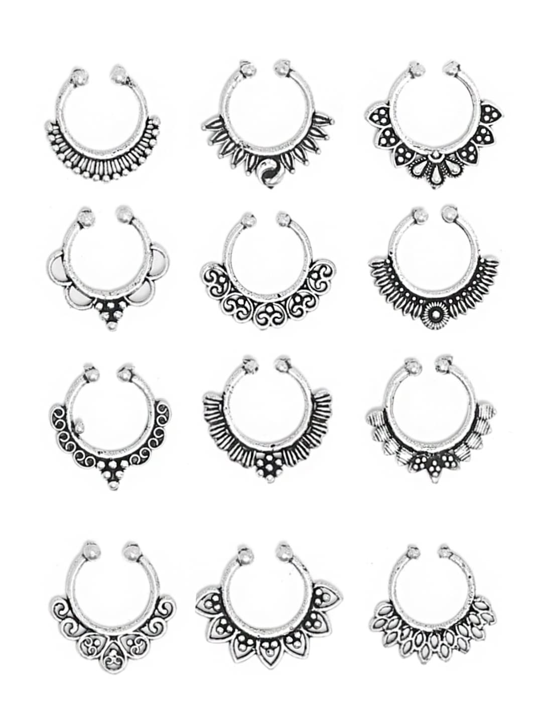 Yellow Chimes Oxidised Nose Rings for Women 12 PCs Non-Piercing Nose Pins Silver Oxidized Snazzy Nose Rings/Nose Studs/Septum For Women and Girls. Nose rings are a piece of jewellery a woman must own. It can change the look of your face in an instant. When you do not want to look too dressy and avoid wearing too much jewellery, a simple silver nose pin can be your go-to piece of jewellery. It can give you a chic look without being too loud. 12 Units Overall: Pack Include 12 Nose Rings Adjustable Adjustable in Size with smooth curves to keep your skin safe. Skin Friendly-: Lead & Nickel Free in compliance with all International Requirements. Gift for women - ideal valentine, birthday, anniversary gift for someone you love. with our packaging box, you do not need to opt-in for any additional gift packaging. the product comes in a beautiful elegant ready-to-gift box.