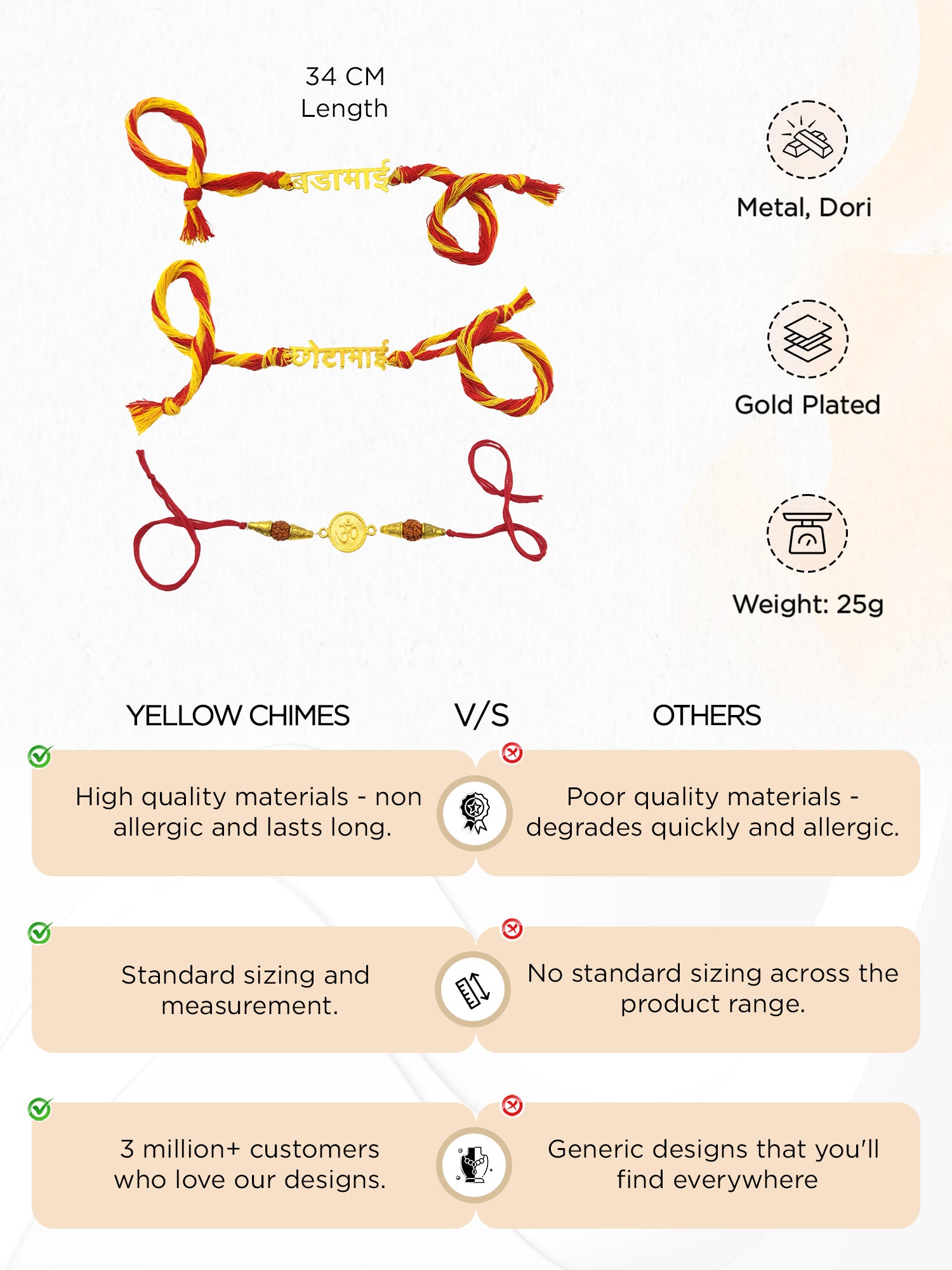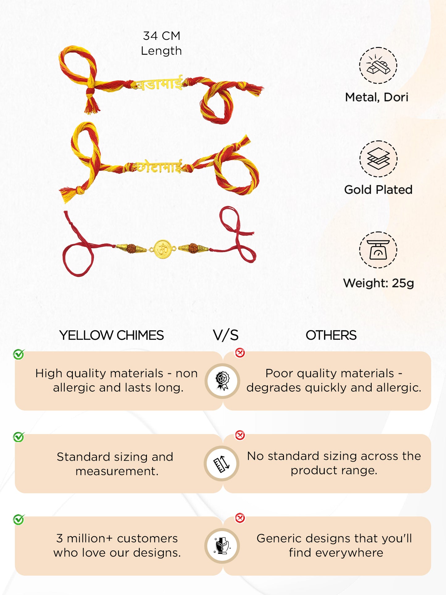 Yellow Chimes Rakhi for Brother | Combo of 3 Rakhi Set for Brother | Traditional Gold Plated Rakhi Set for Brother and Sister| Rakhi with Roli, Chawal and Greeting Card