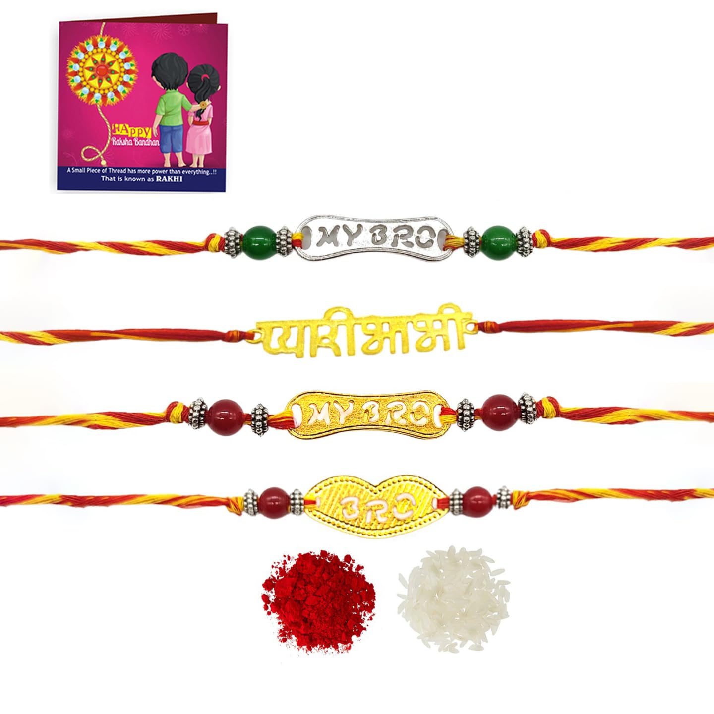 - Rakhi Combo: This combo includes three beautifully crafted Rakhi for brother and essential accessories like roli, chawal, and a free greeting card. The rakhi combo includes My bro / bhabi rakhi set