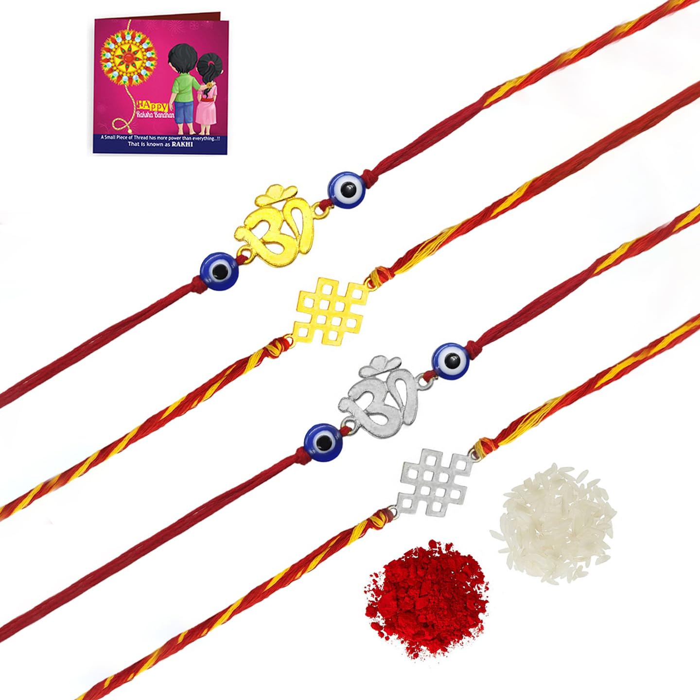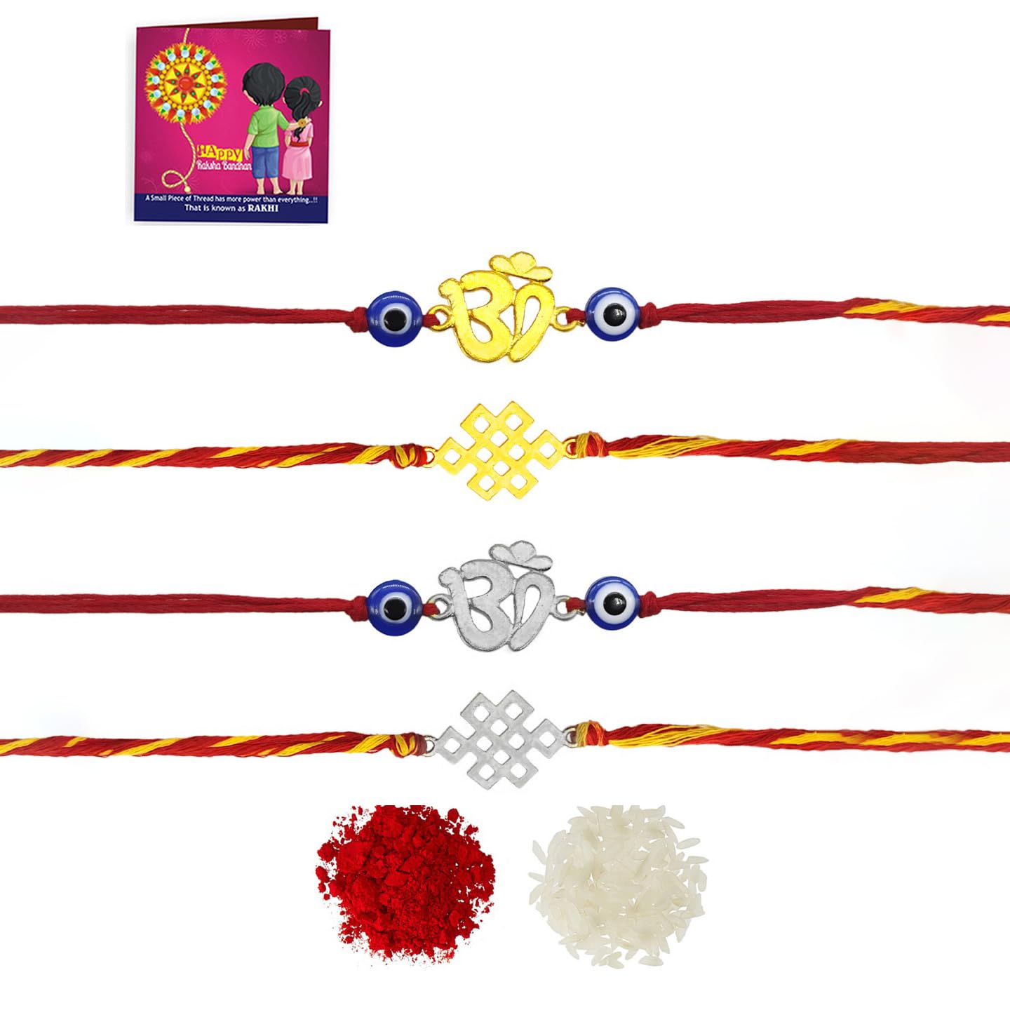 Rakhi for Brother | Combo of 4 Rakhi Set for Brother | Traditional Gold and Silver Plated Rakhi Set for Brother and Sister| Rakhi with Roli, Chawal and Greeting Card
