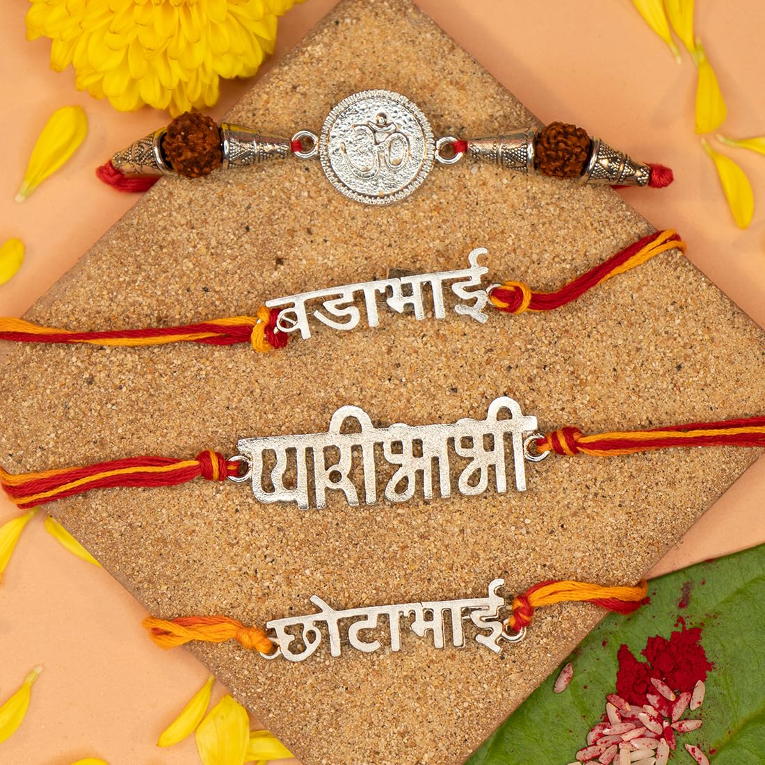 Rakhi for Brother | Combo of 4 Rakhi Set for Brother | Traditional Silver Plated Rakhi Set for Brother and Sister| Rakhi with Roli, Chawal and Greeting Card
