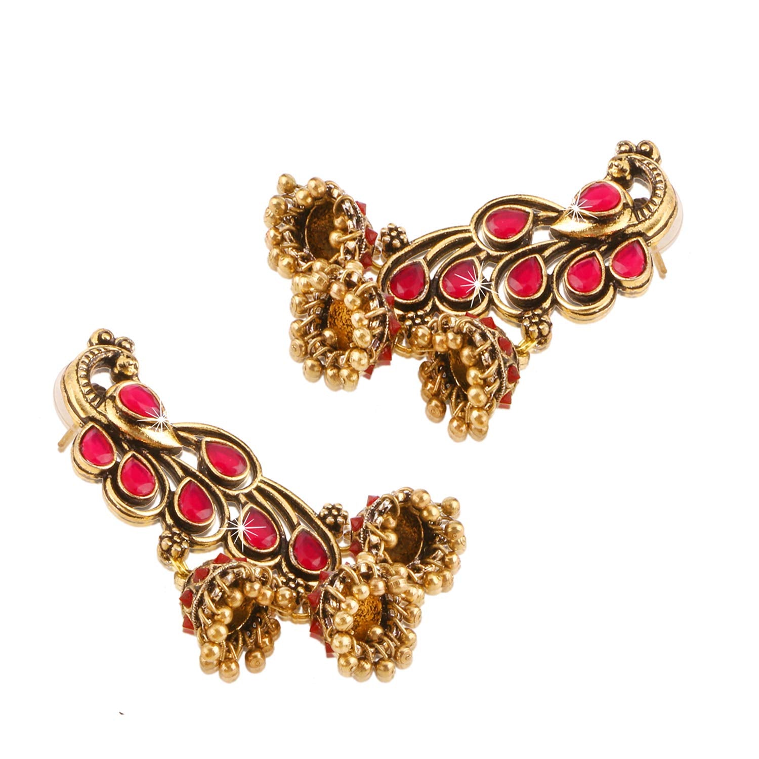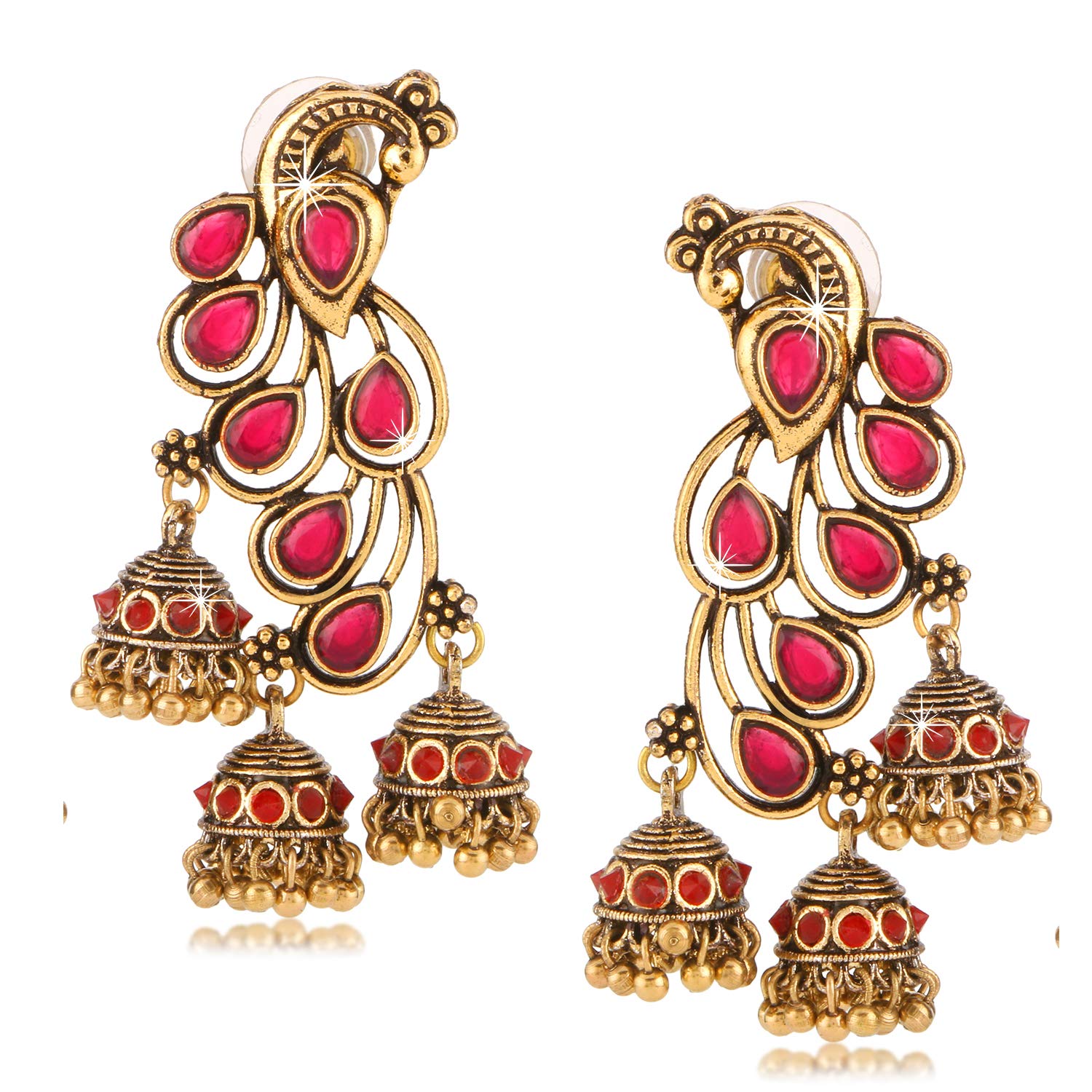 Red Stones Peacock Inspired Latest Trend Festive Oxidized Golden Traditional Jhumkas Earrings for Women and Girls