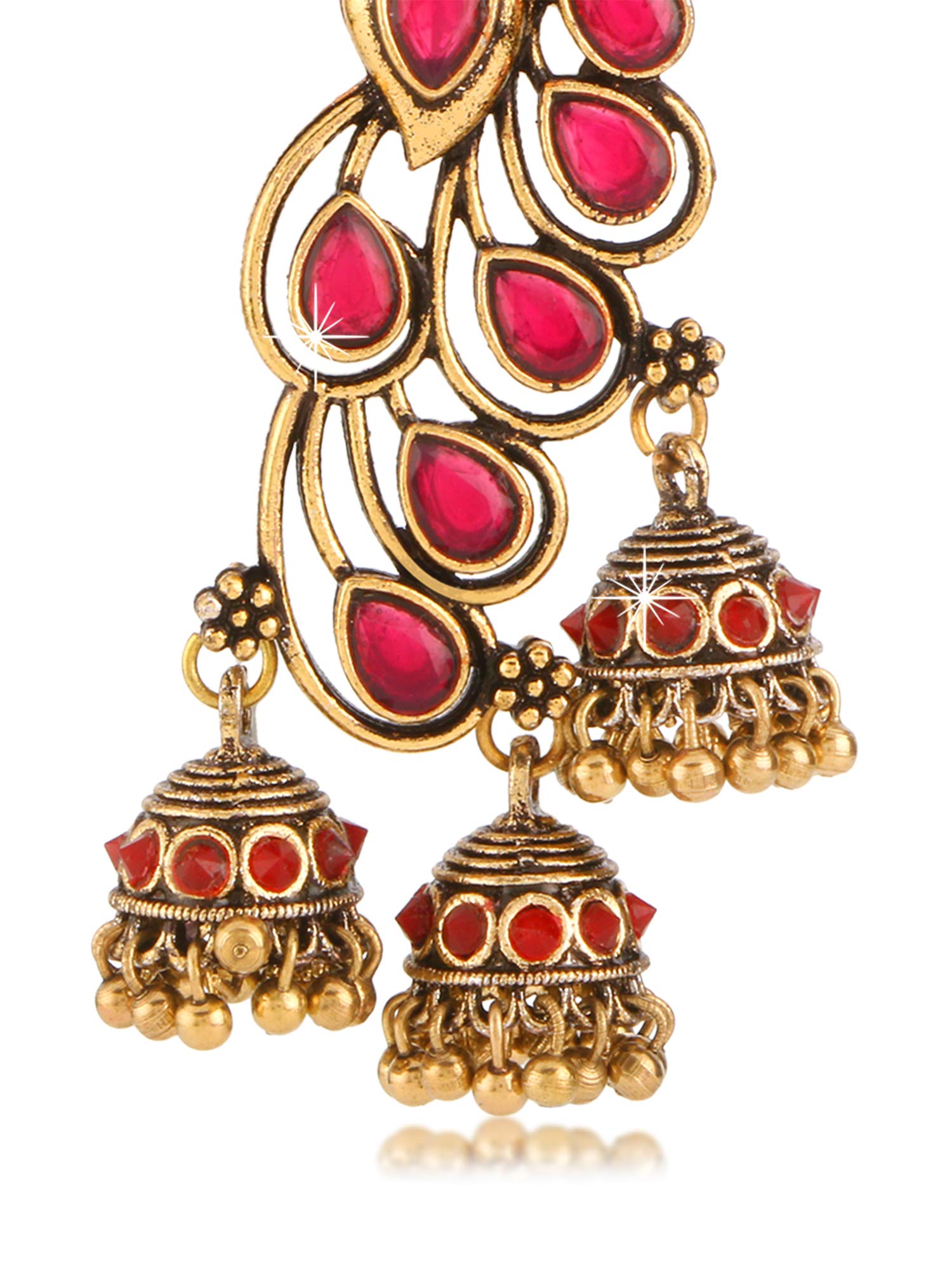 Transform your festive look with the Yellow Chimes Red Stones Peacock Inspired Latest Trend Festive Oxidized Golden Traditional Jhumkas Earrings. These exquisite earrings are designed to be the perfect complement to your party and traditional outfits, making you shine at every occasion.