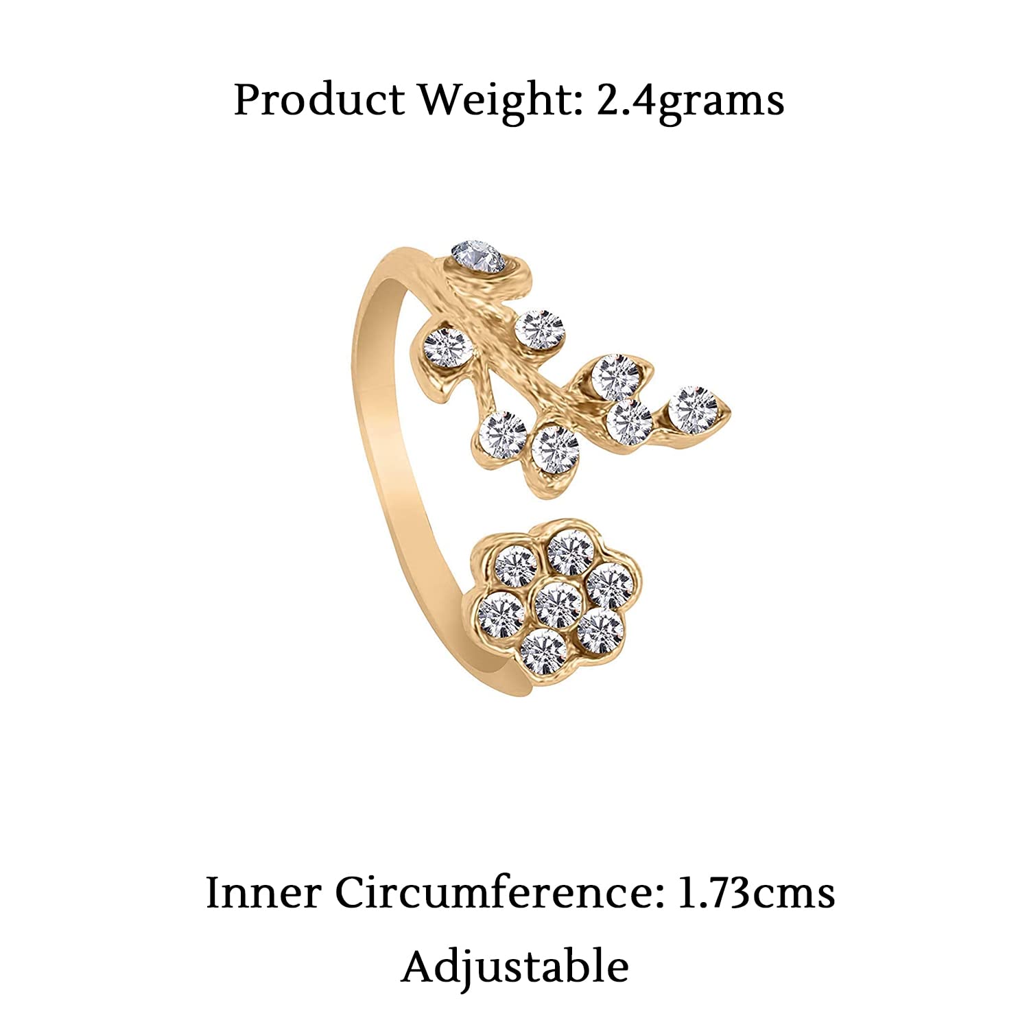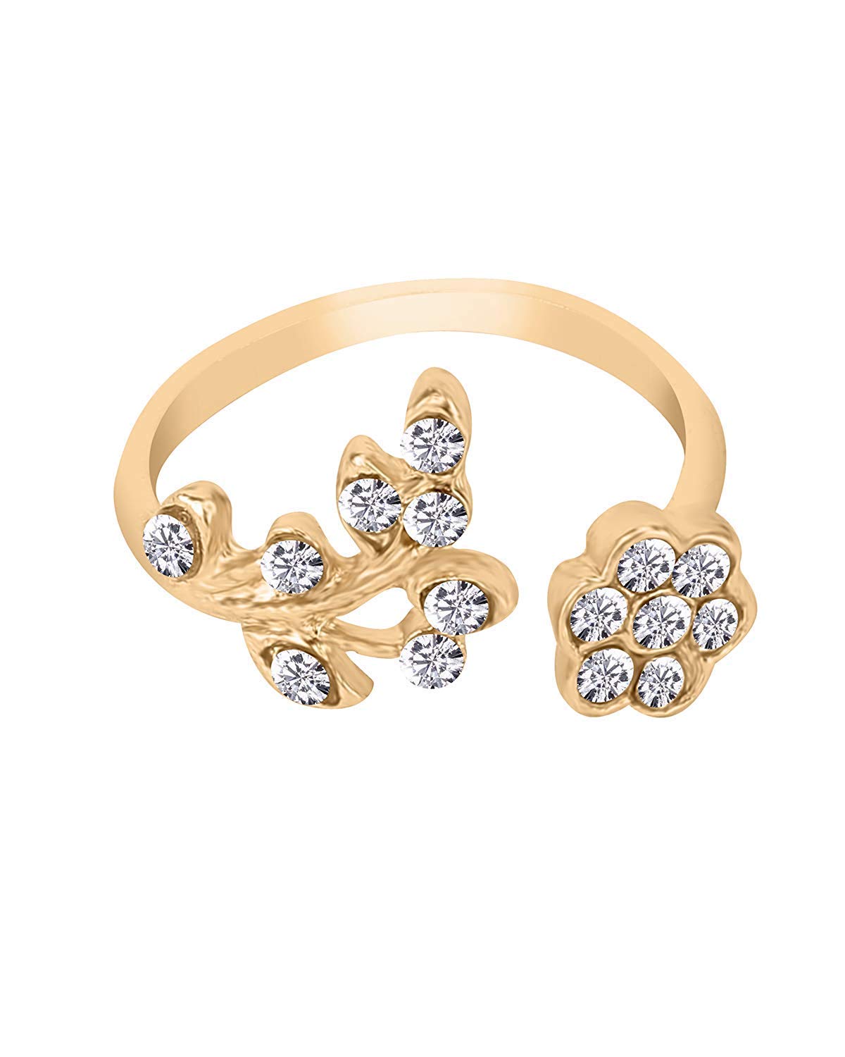 Elevate your style with the Yellow Chimes Rhinestone Twisted Leaves Flower Opening Gold Plated Ring. This exquisite piece is designed for women and girls who appreciate elegance and femininity in their accessories.