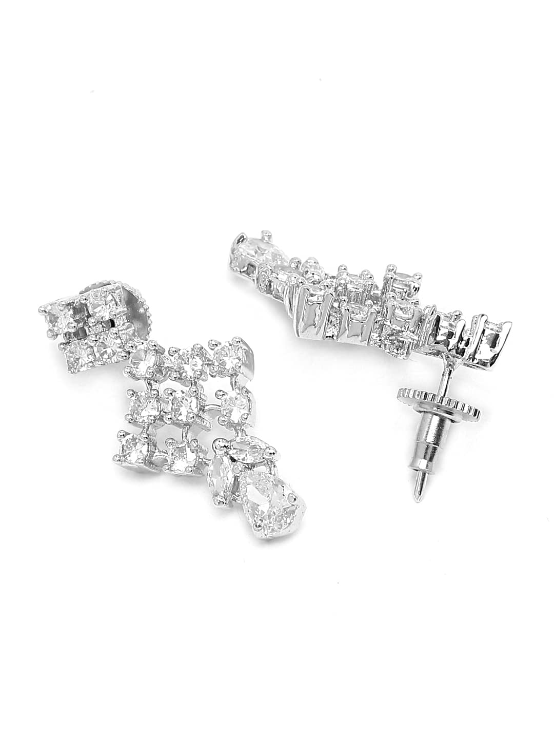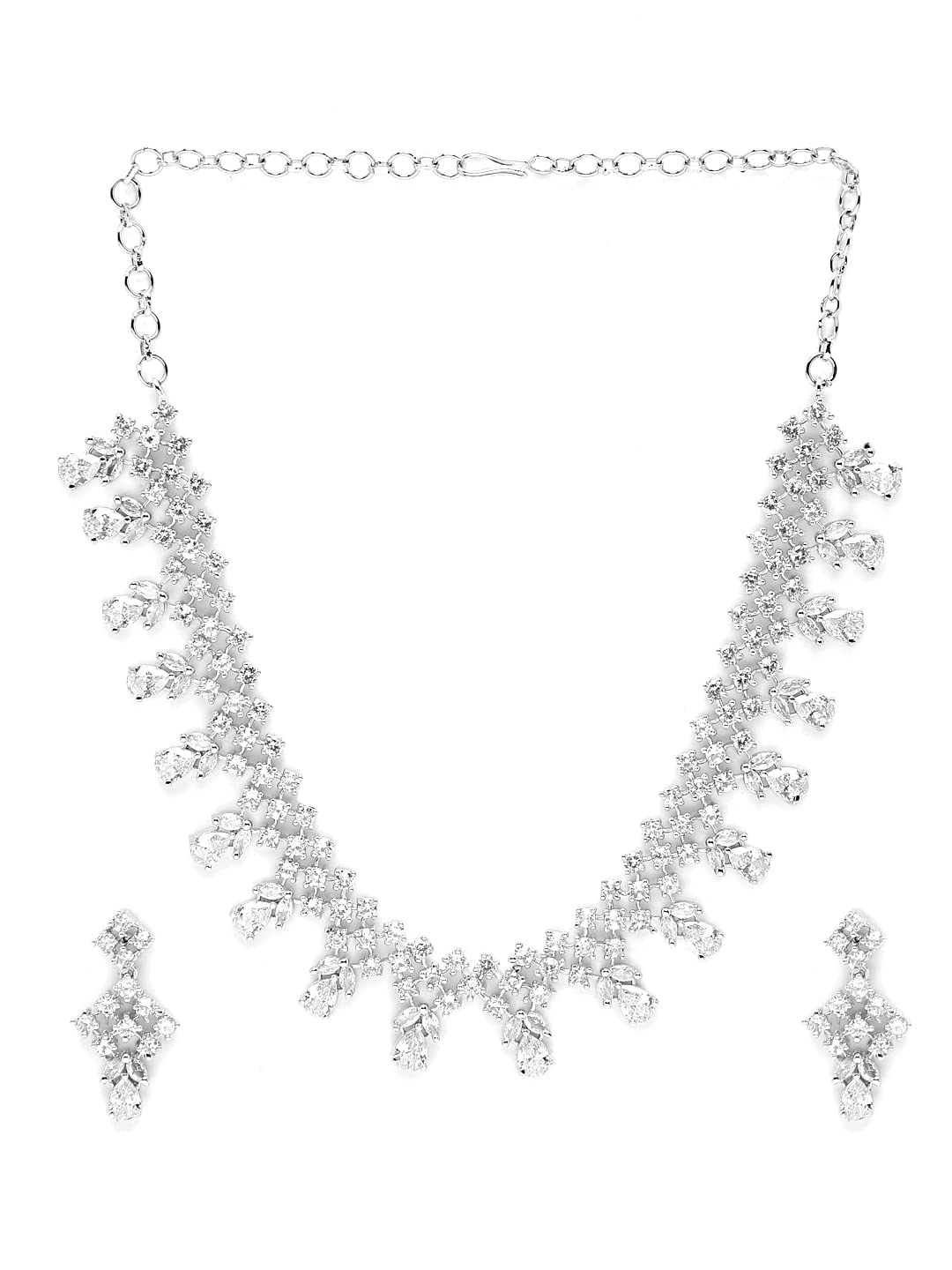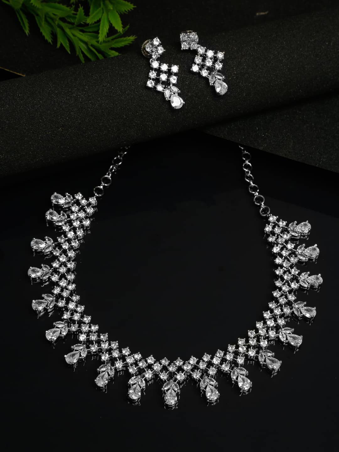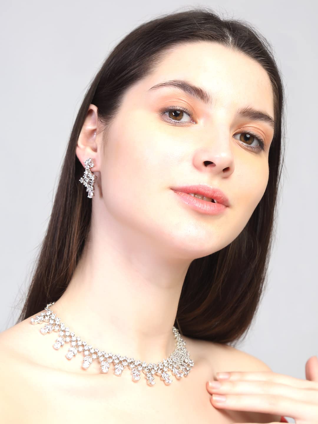 - Elegant & lovely white American Diamond Necklace set for women is a classic piece that set itself distinct ad way apart, can light up the room solitarily with its sparkle.This Rhodium Plated AD Jewellery Set for Women with Drop Earrings A5 Grade clarity is Stunning & Preciously.Our Product is perfect for valentines Anniversary Birthday gift for Women,girlfriend,Wife.