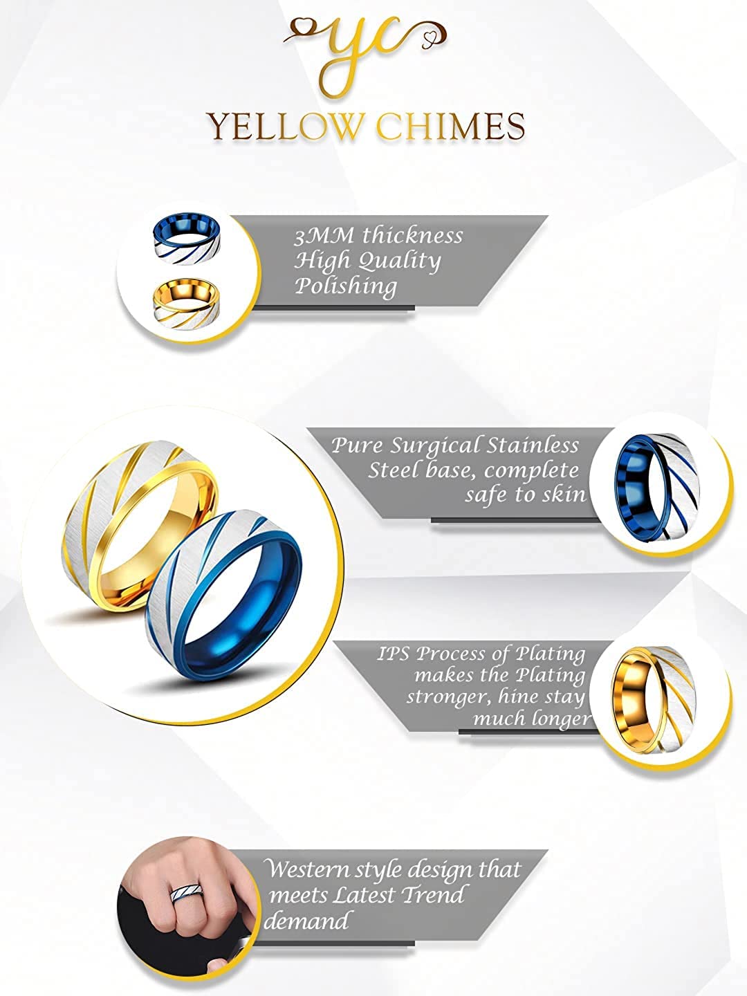 Yellow Chimes Rings for Men 2 pcs combo Blue and Gold Stylish Western Stainless Steel Metal band Designed Rings for men and boys Classic, Stylish and Durable, excellent scratch resistant performance. suitable for Men Best suitable for Men. Size is US 10, which in 19.8 mm of inner Diameter PLATING - IPS process of plating makes it never fading of color, and keeps the shine PREMIUM QUALITY: Pure surgical stainless steel is used to make this product, which doesnt cause any harm to skin. Nickel free and Lead free as per International Standards. No harm to health Gift for men! - ideal valentine, birthday, anniversary gift for someone you love. with our packaging box, you do not need to opt-in for any additional gift packaging. the product comes in a beautiful elegant ready-to-gift box