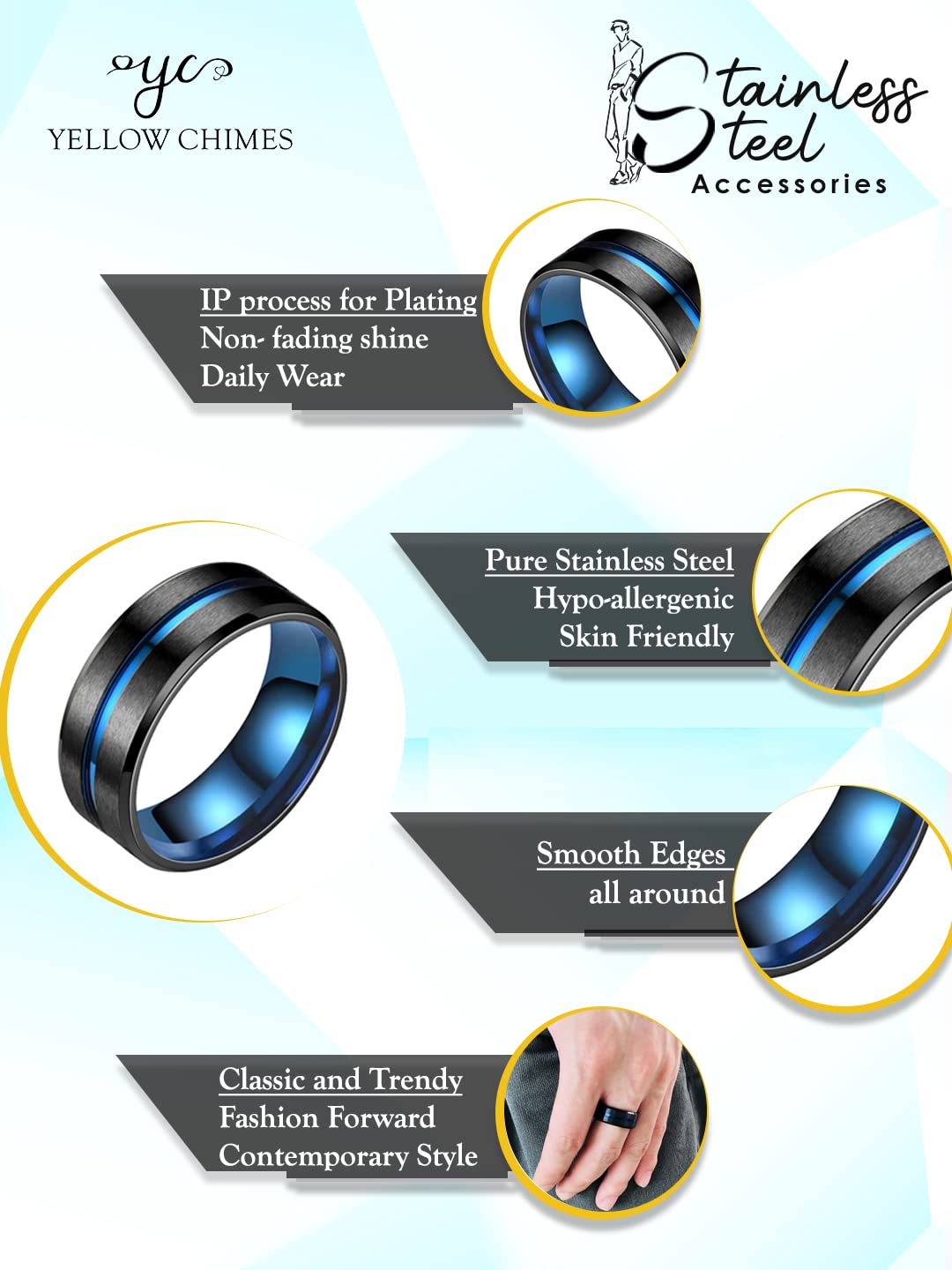 Yellow Chimes Rings for Men and Boys | Double Colored Toned Ring for Men | Band Finger Men's Ring | Stainless Steel Rings for Men | Accessories Jewellery for Men | Birthday Gift for Men and Boys Anniversary Gift for Husband (Size US 10) Simple and Elegant Double Colored toned Band Designed Stainless Steel Smooth Finished Ring for Men. Our Product is perfect for valentines Anniversary Birthday gift for Husband and Boyfriend. Size is US 10, which in 19.8 MM of inner circumference, Material and Metal is Stainless Steel. Care Instructions: Harsh Usage or scratching, Avoid Harsh Chemicals. Wipe with soft cloth in case of dust accumulation. Packaging- Your favorite piece of Jewellery will reach you in an Elegant Yellow Chimes box with safety and precautions. You can leave it to us the job of delivering your Jewellery in original condition to you at your door-step. Brand Vision - Yellow Chimes is the one stop solution for all jewellery lovers- which is affordable and can fit for any occasion you pick to shape your own style and personality.
