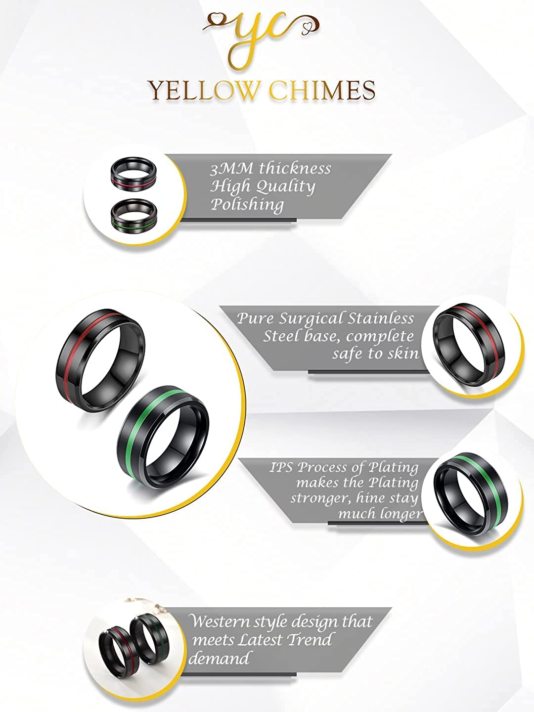 Yellow Chimes Rings for Men Combo of 2 Pcs Stainless Steel Rings Black Toned Grooved Center Band Rings for Men and Boys Classic and Durable, excellent scratch resistant performance Perfect width and light weight suitable for daily wear Size- US 10, which in 19.8 mm of Diameter. Plating Information:- IPS process of plating makes it never fading of color, and keeps the shine Quality: Stainless steel built, highly resistant to rust and corrosion Smooth polish makes it comfortable to wear Its weight and style makes it suitable for Men GIFT FOR MEN - Ideal Valentine, Birthday, Anniversary gift for someone you LOVE. With our packaging Box, you do not need to opt-in for any additional gift packagingThe product comes in a beautiful Elegant Jewellery Box/ Pouch