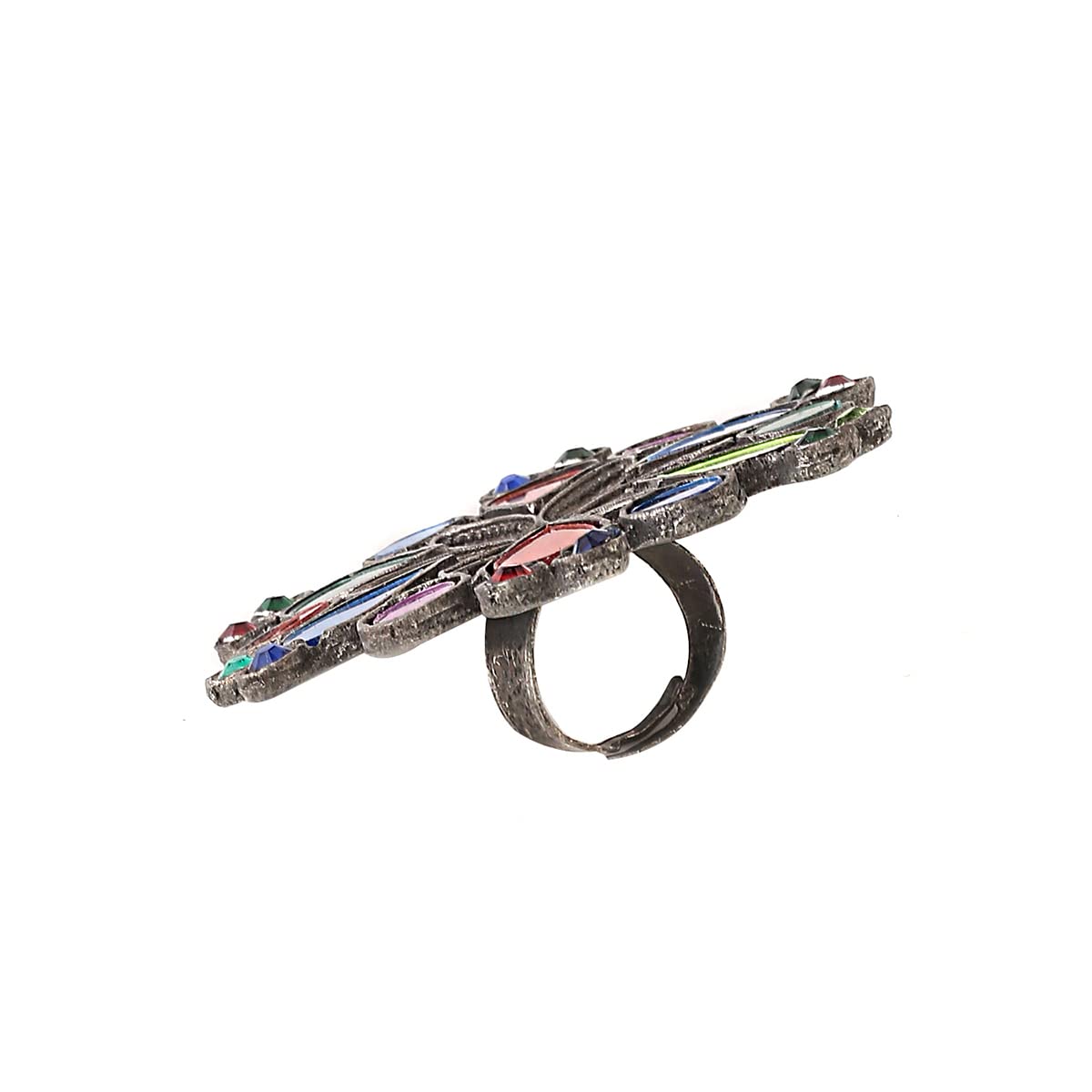 - Handcrafted _multicolor Stone Studded Tribal Design Oxidised Antique looks adjustable Finger Ring. Design inspired by Bold statement demands of today.