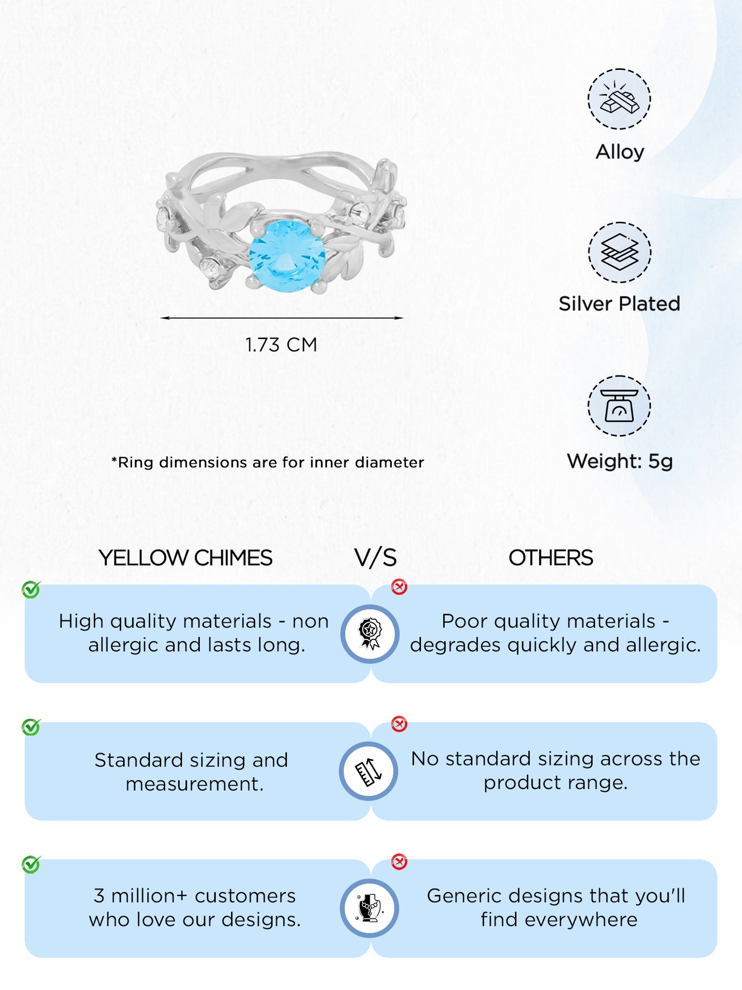 - Size- US 7, which in 17.3 MM of inner circumference. Metal is Alloy and Material is Silver Plated.