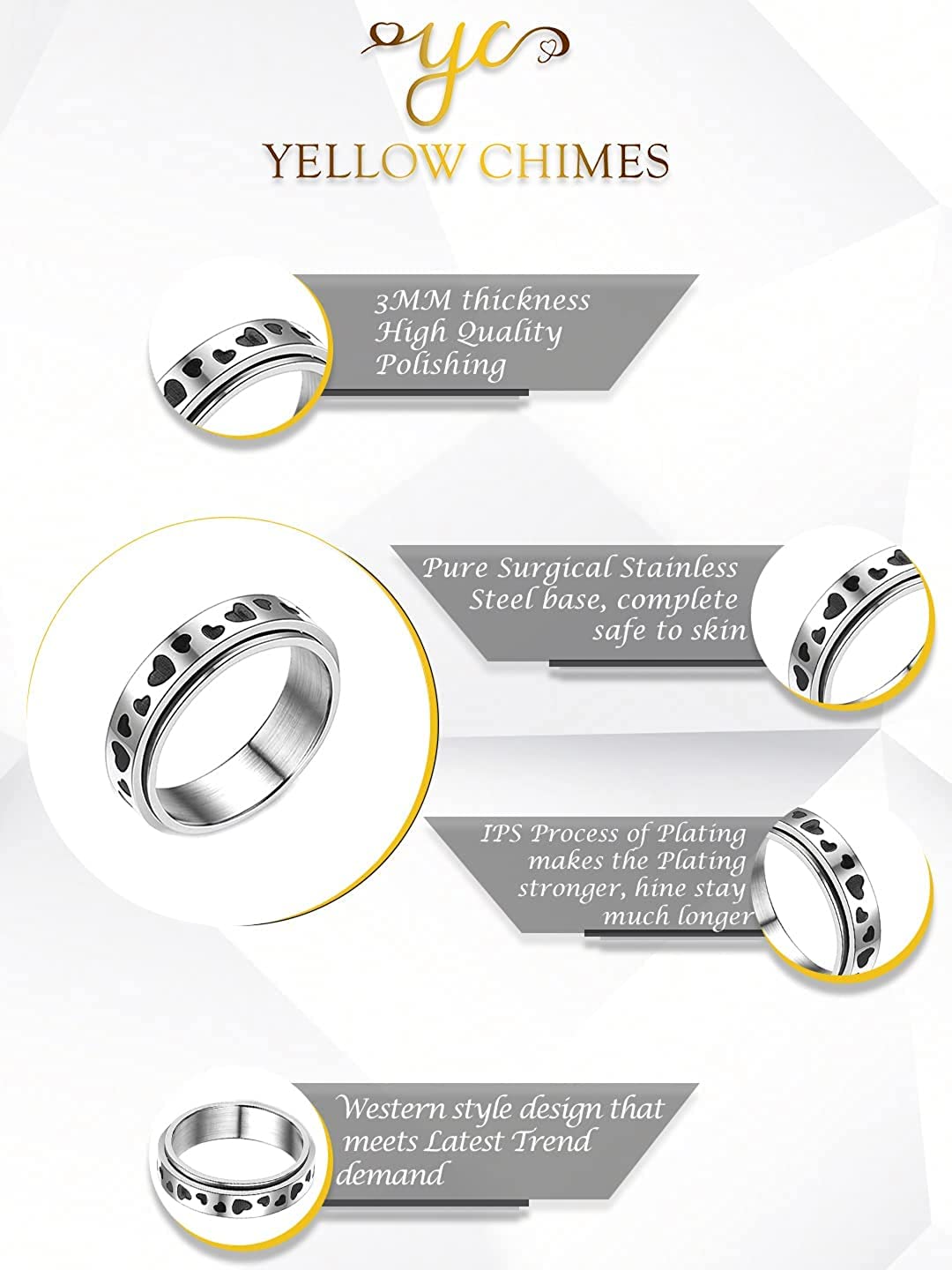 Yellow Chimes Rings For Women Silver Plated Spinner Stainless Steel Stress Relieving Rotatable Spinner Ring for Women and Girls(Size US 6) Classic, Weighty and Durable, excellent scratch resistant performance. Perfect width, suitable for Men and Women PLATING - IPS process of plating makes it never fading of color, and keeps the shine HIGH QUALITY MATERIAL-- Our fidget band cool rings are made of quality stainless steel, solid and durable, healthy material, harmless to your body; highly poshlied with rings inner surface, scratch resistant. The surface smearing effect is more retro and fashionable. Spinner design ,get you through stress and help reduce anxiety, and enhance your mood. Cool and dainty, fidget band rings has IPS process of plating makes it never fading of color, and keeps the shine. Gift for Men and Women - Ideal Valentine, Birthday, Anniversary gift for someone you LOVE . With our packaging Box, you do not need to opt-in for any additional gift packaging. The product comes in a beautiful Elegant Ready-to-Gift Box.