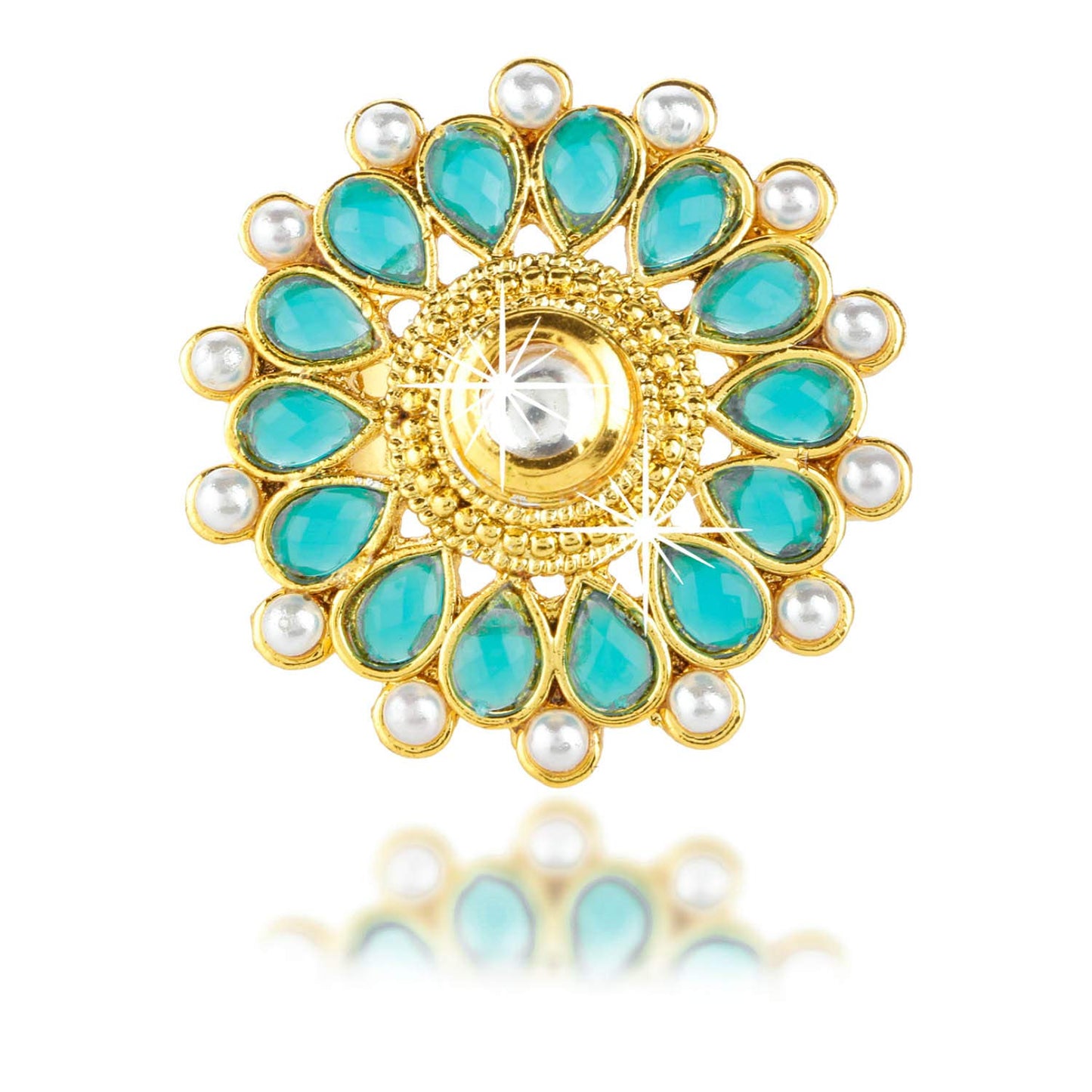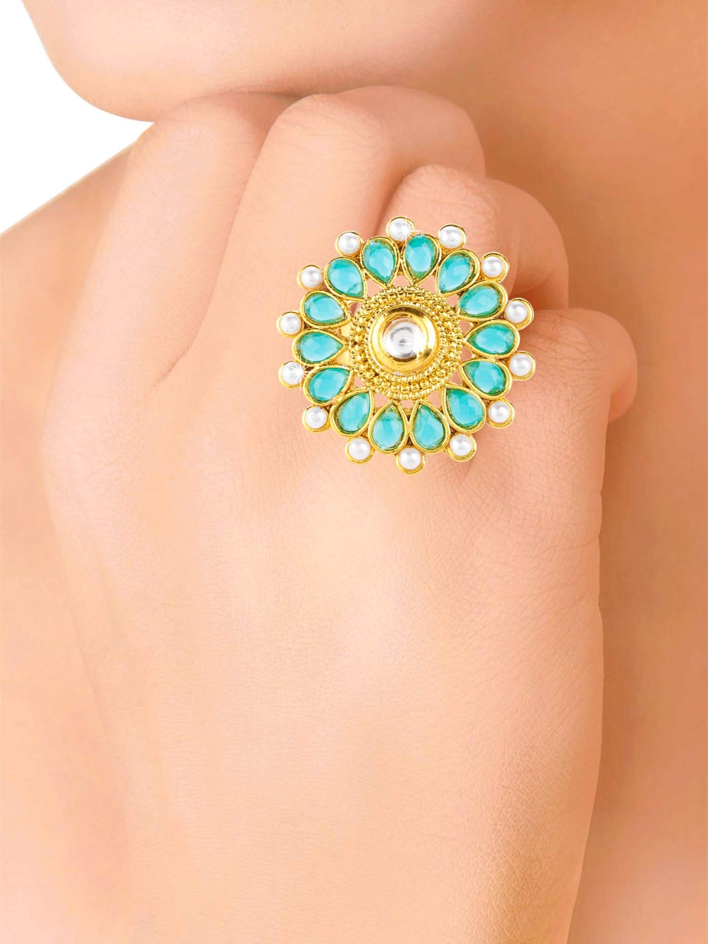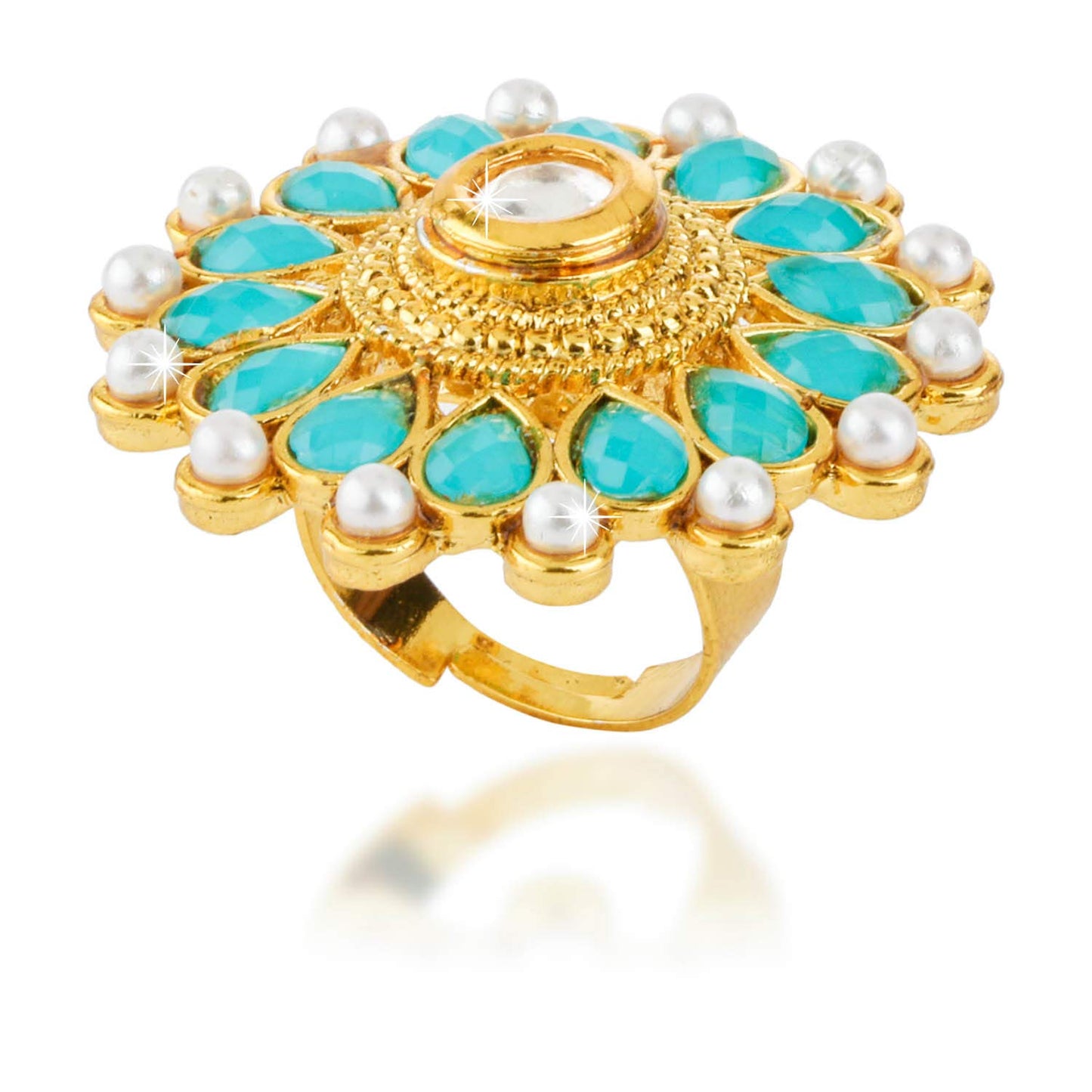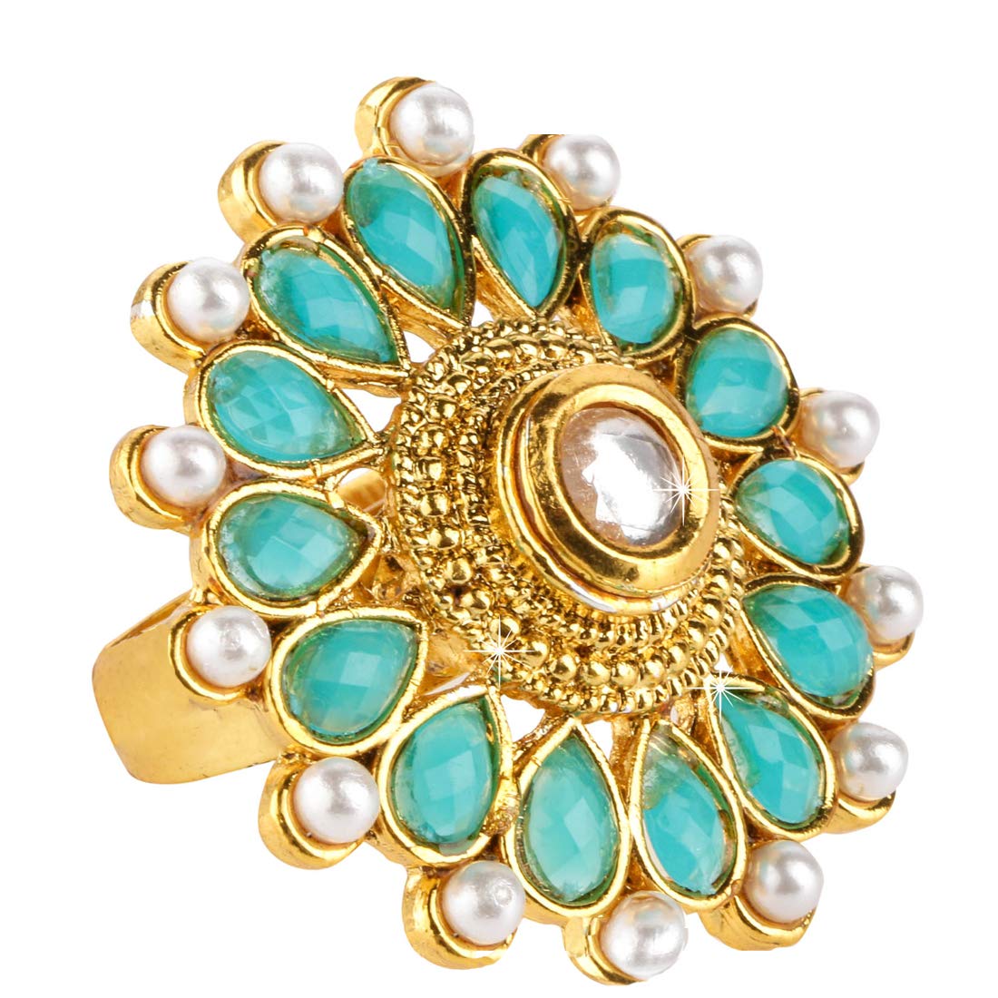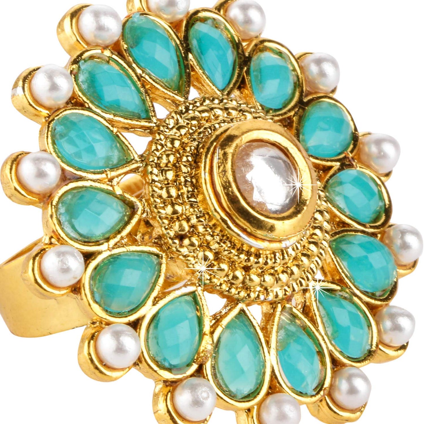Yellow Chimes Rings for Women Traditional Rings Turquoise Pearl Studded Gold Plated Cocktail Wedding Rings for Women and Girls.