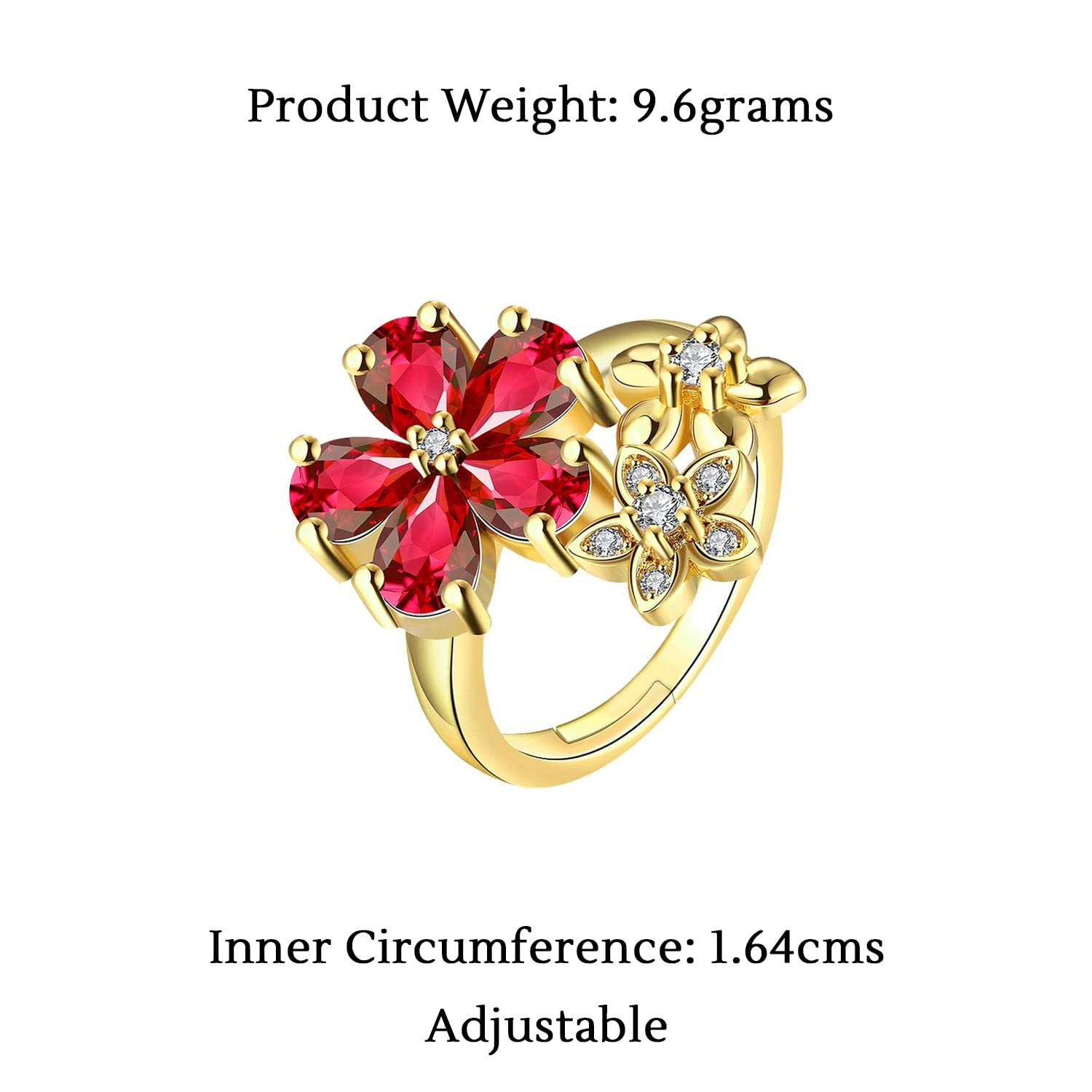 Yellow Chimes Rings for Women White and Red stoned Crystal Floral Designed Gold toned Smooth Finished Ring for Women and Girls Graceful, unmatched Style, sparkling and feminine- this Ring bedecked with high grade Crystals in red and white Color is all done to add glamour to any attire. Spruce up your outfit with the glitter of this Feminine Ring. Looks- Yellow Chimes by Globalbees brings Crystal Collection selective pieces to you with beautiful Looks at one Glance in Glamorous Reflections. Style them with a western attire or a traditional fusion, they are going to catch everyones Attention! Quality -used only high grade Crystals that looks like diamond. Gold polished so it doesn't turn black. Brass Metal for durability. Comfortable lightweight to be worn all day long Size- US 8, which in 18.2 mm of inner circumfrence. It is advisable to please check your ring for knowing the diameter that fits you Gift for women! - ideal valentine, birthday, anniversary gift for someone you love . with our packaging box, you do not need to opt-in for any additional gift packaging. the product comes in a beautiful elegant ready-to-gift box