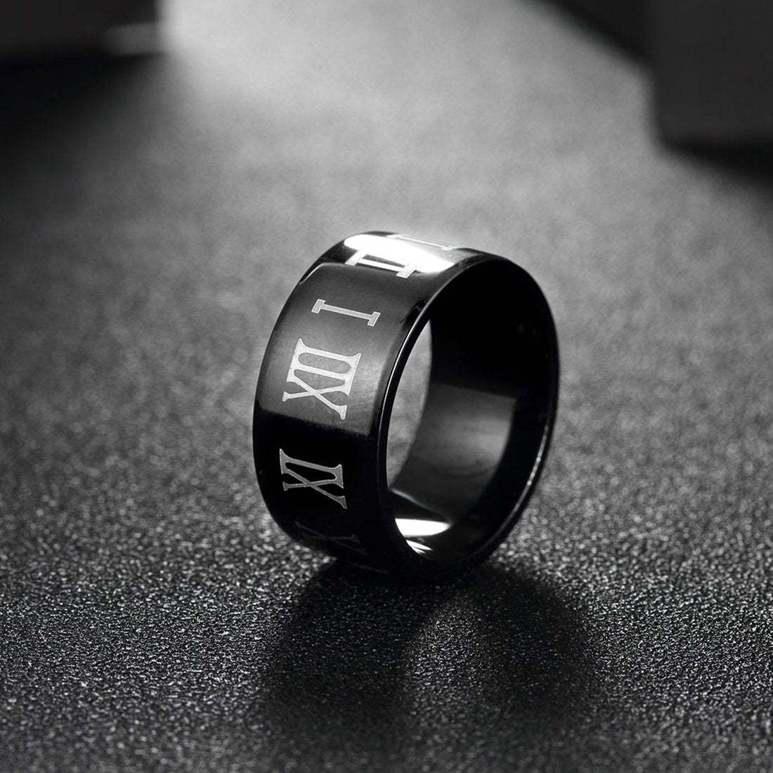 - A Stylish Western Looks Ring with engraved Roman letter on Black Gun Plated surface - comes out a classical choice.