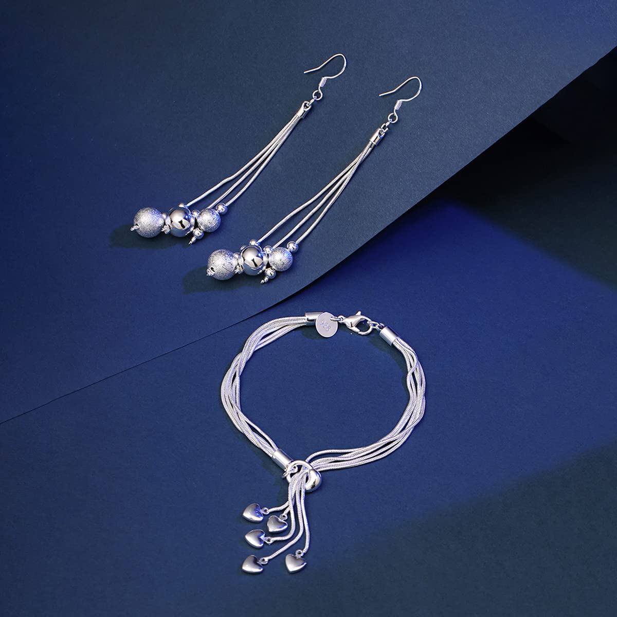 Silver Earrings Bracelet Set for Women Hanging Love Heart Charm Bracelet Silver Plated Tassel Earrings Bracelet Set for Women and Girls.