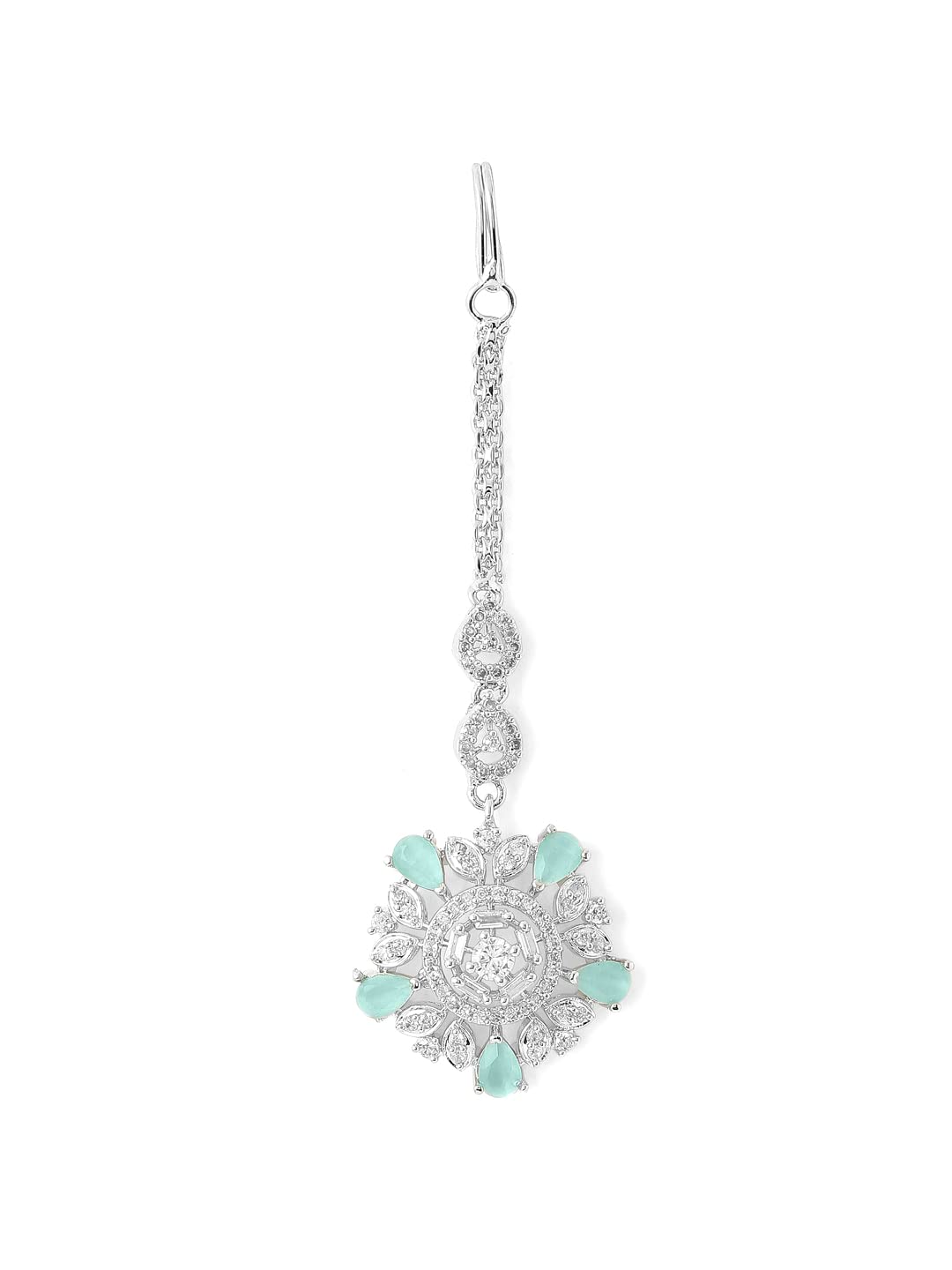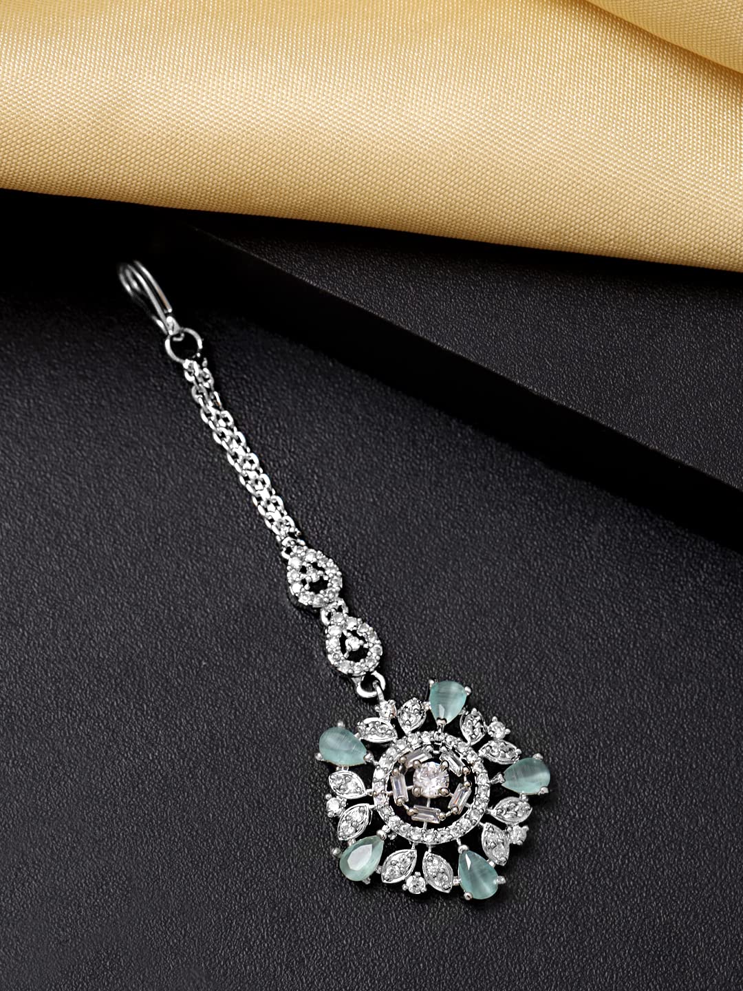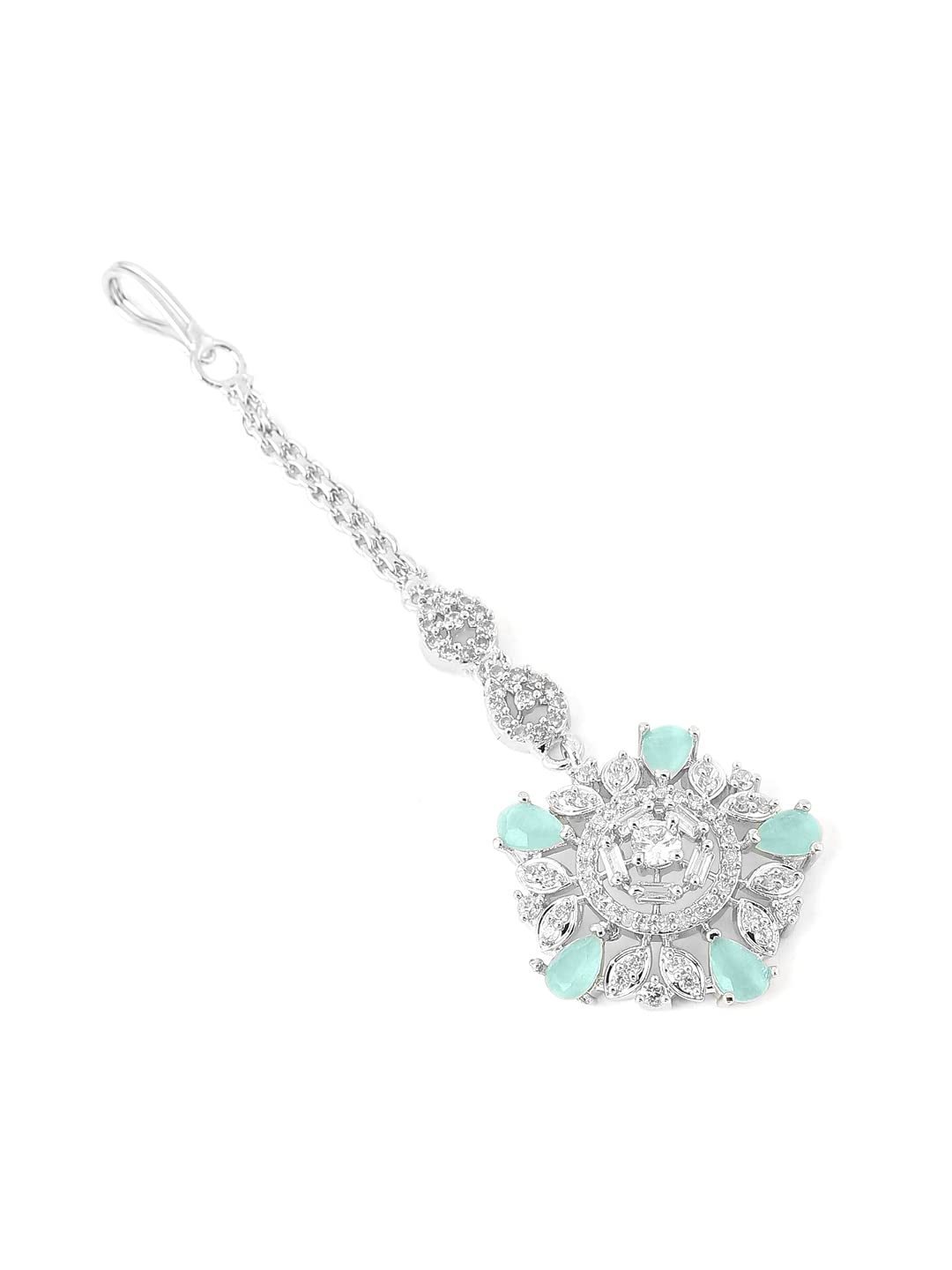 Yellow Chimes Silver Plated Luxury Sea Green Color AD Studded Penta Shape Design Handcrafted Maang Tika For Women & Girls