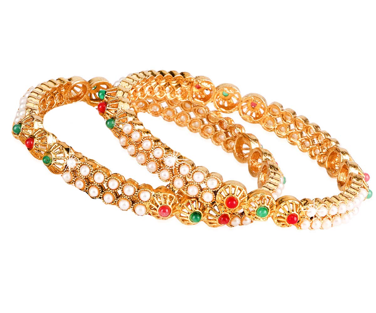 Stone Work Moti Craftmanship Copper Gold Plated 2 Pc Bangles Traditional Bangle Set for Women and Girls (2.6)