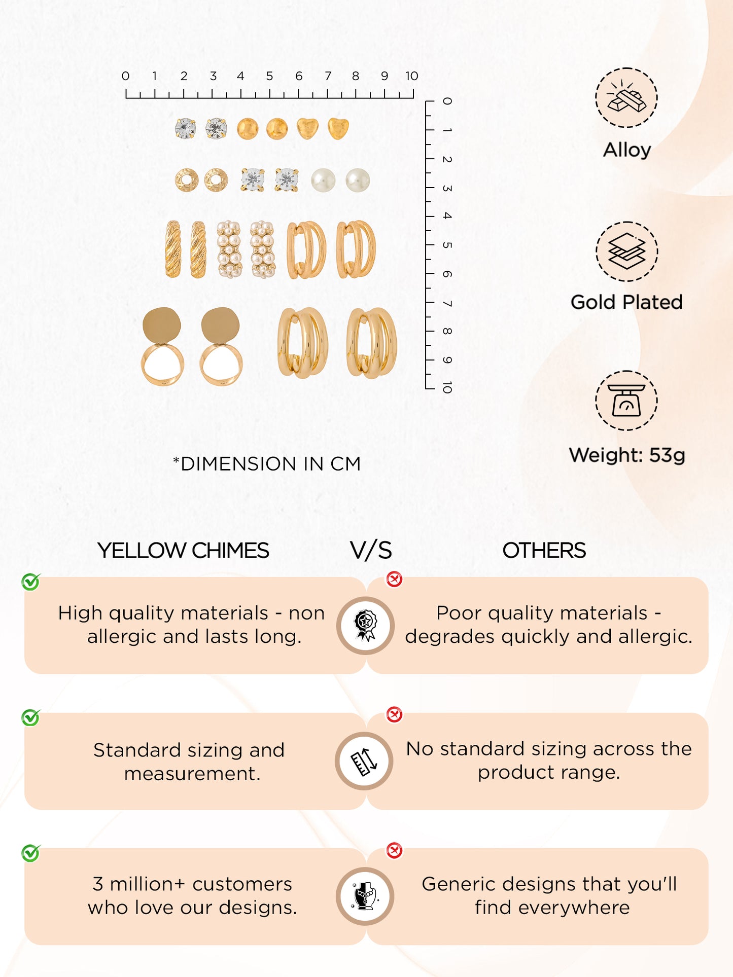 Yellow Chimes Stud Earrings for Women | Fashion Gold Earrings for Girls Combo of 12 Pairs Stud Hoop Earrings Set | Big Hoops Set Women Earrings | Birthday Gift For Girls Anniversary Gift for Wife COMBO SET FOR VERSATILITY: This set of 12 pairs of Earrings offers a variety of styles for different occasions. From Stud & Hoops to Gold Toned pearls Studded designs, this combo set has something for everyone. Ideal for gifting to mothers, friends, and wives, these earrings are perfect for adding a touch of elegance to any outfit. LIGHTWEIGHT & SECURE: These Earrings are not only stylish but also lightweight, making them comfortable for all-day wear. The Push & Back closure ensures a secure fit, so you can wear them with confidence. People love the lightweight feel and great quality of these earrings, making them a must-have accessory for everyday wear. SIZE DETAILS: Average Stud Earring Length is 0.5 CM * Width is 0.5 CM. Average Hoop Earring Length is 6 CM * Width is 5.5 CM. Weight is 53gr. Material is Gold Plated and Metal is Alloy, Closure is Push back. PACKAGING: Your favorite piece of Jewellery will reach you in an Elegant Yellow Chimes box with safety and precautions. You can leave it to us the job of delivering your Jewellery in original condition to you at your door-step.