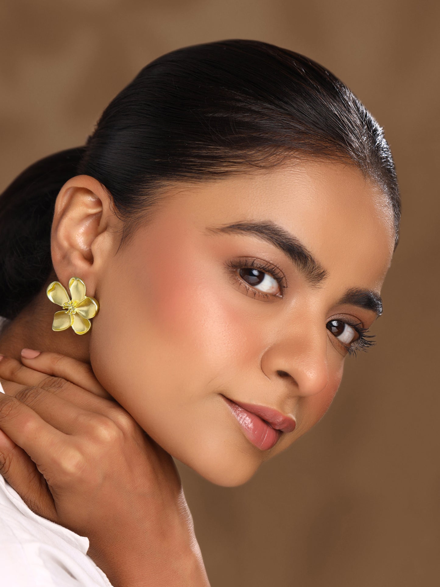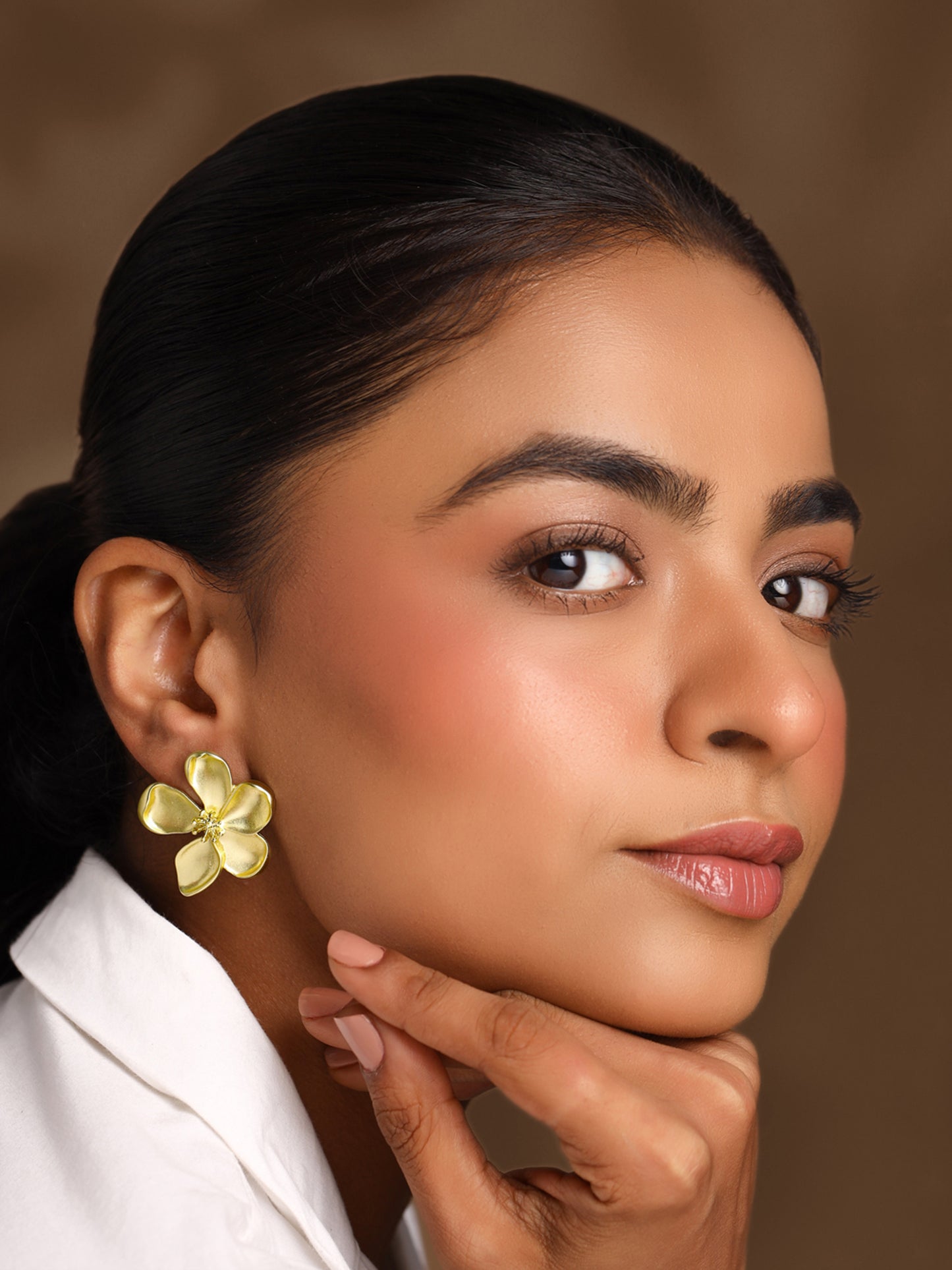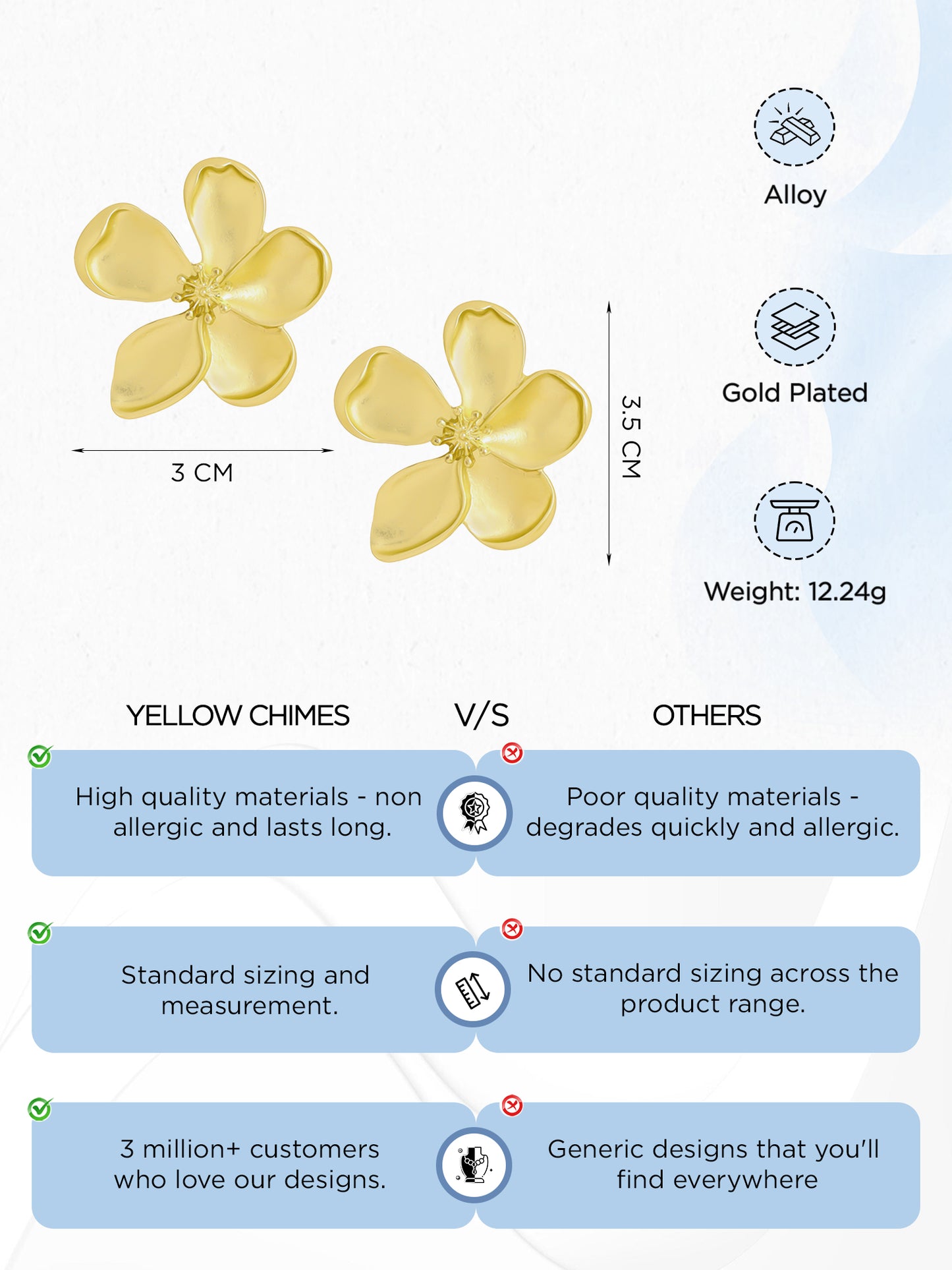 Yellow Chimes Stud Earrings for Women | Fashion Golden Studs Earrings for Girls | Western Style Floral Shaped Women Earrings | Birthday Anniversary Gift for Girls Wife LIGHTWEIGHT & COMFORTABLE: Enjoy all-day comfort with these versatile earrings style without the weight. Effortlessly pair these earrings with party outfits, western sarees, or casual looks for any occasion. VERSATILE USAGE: Perfect for any occasion, these stylish earrings pair beautifully with both casual and formal attire for a sophisticated flair. Delight loved ones with these exquisite earrings perfect for birthdays, anniversaries, or any special celebration. Size Details: Earring Length is 3.5 CM * Width is 3 CM. Weight is 12.24 gr. Material is Gold Plated and Metal is Alloy, Closure is Push & Back. PACKAGING: Your favorite piece of Jewellery will reach you in an Elegant Yellow Chimes box with safety and precautions. You can leave it to us the job of delivering your Jewellery in original condition to you at your door-step. ELEGANT DESIGN: Luxurious gold-plated floral studs elevate any outfit, perfect for any occasion. With a sturdy push-back clasp, enjoy a fabulous look and a worry-free fit. Experience elegance without the weight perfect for daily wear without sacrificing comfort.
