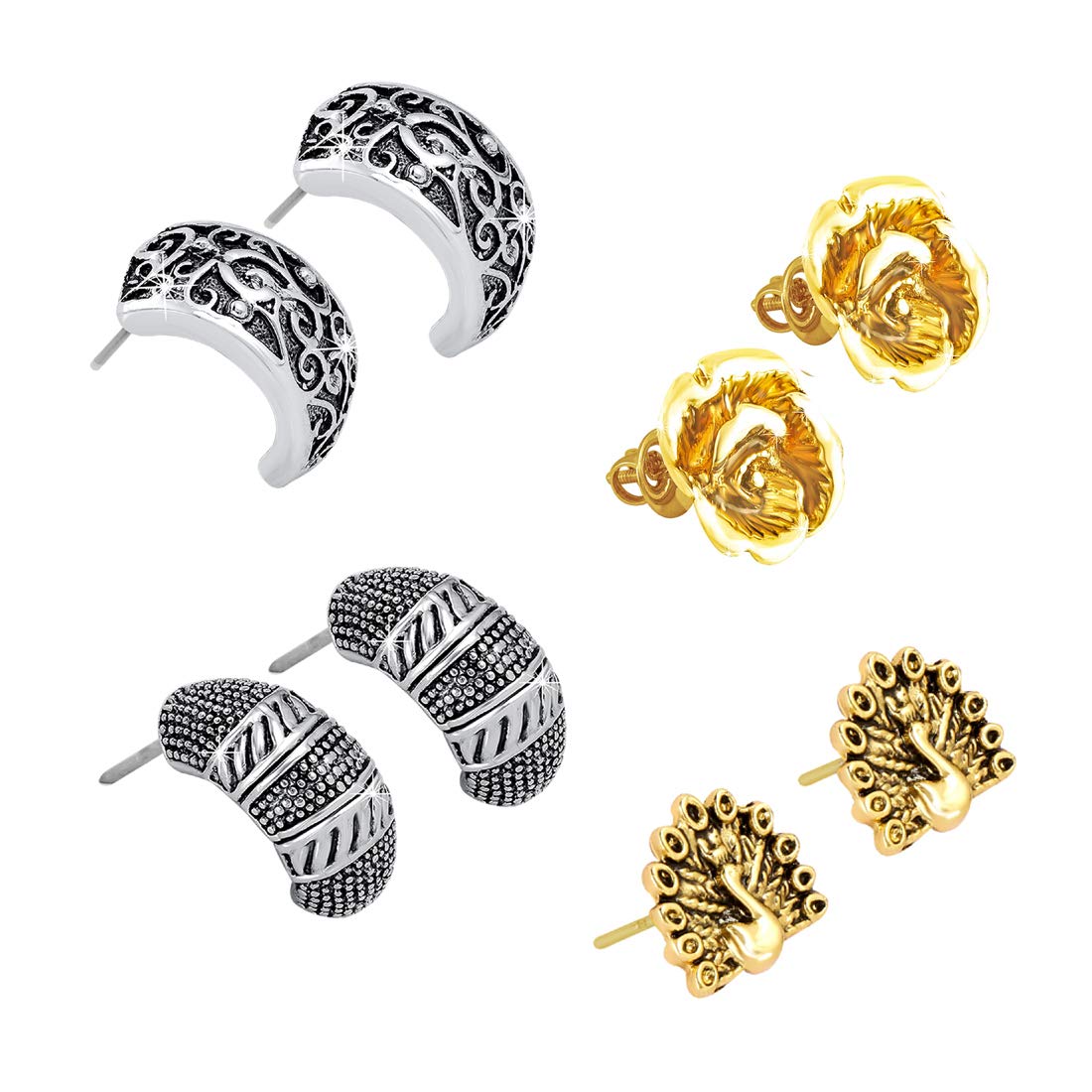 Yellow Chimes Stylish COMBO 4 Pairs Silver Oxidized Designer Traditional Studs Earrings for Women and Girls (Combo-2)
