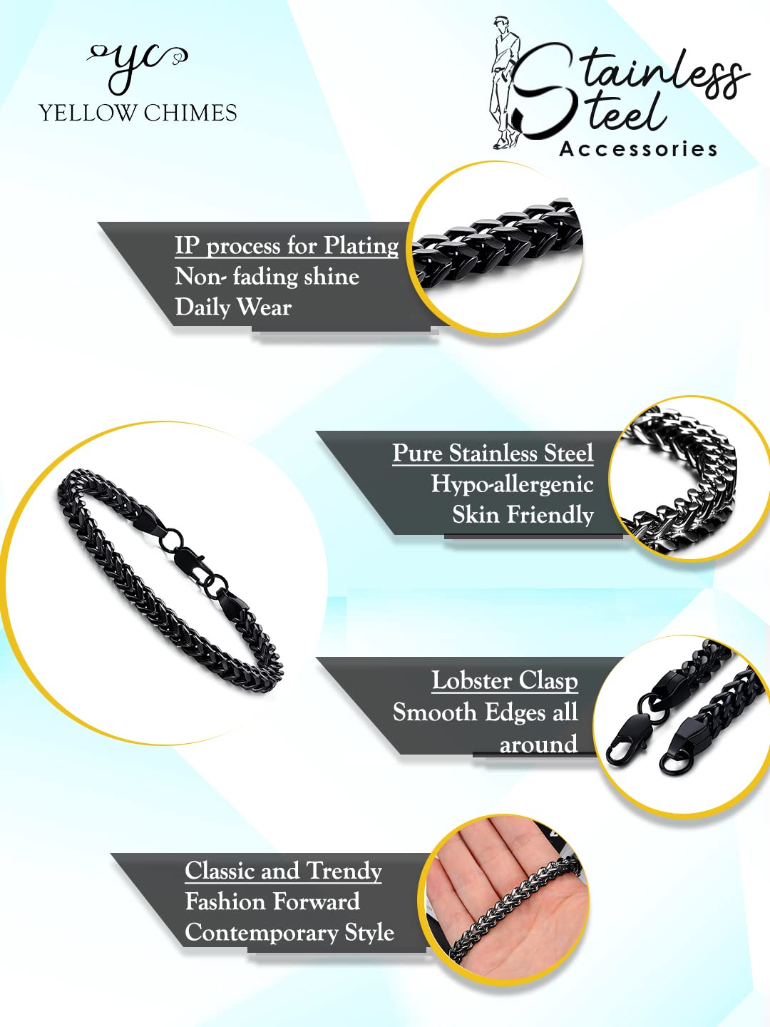 Whether you're dressing up for a special occasion or looking to enhance your everyday attire, the Yellow Chimes Stylish Stainless Steel Curb Chain Black Bracelet is your go-to choice. Its sleek and modern design seamlessly complements any outfit, making it a versatile addition to your accessory collection.