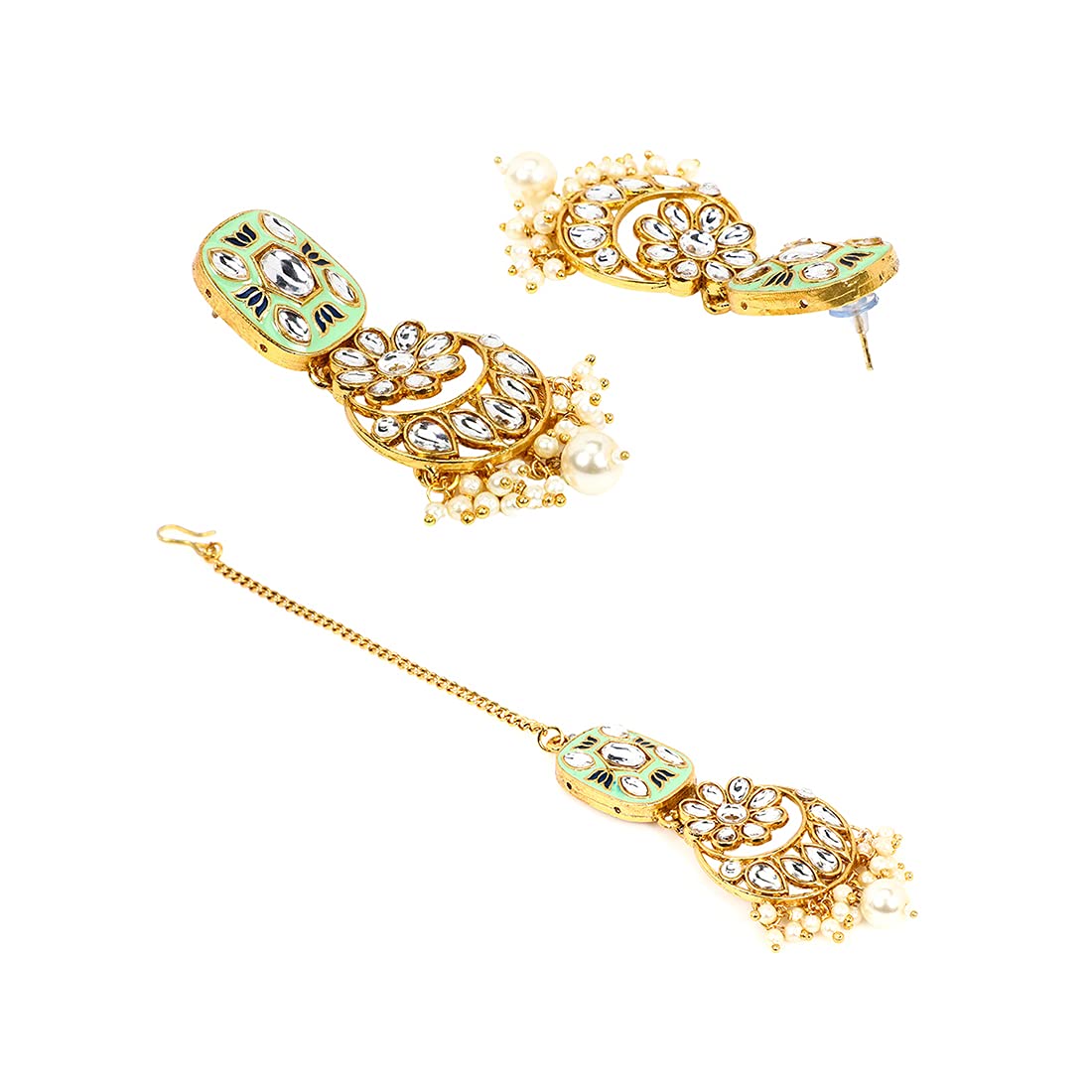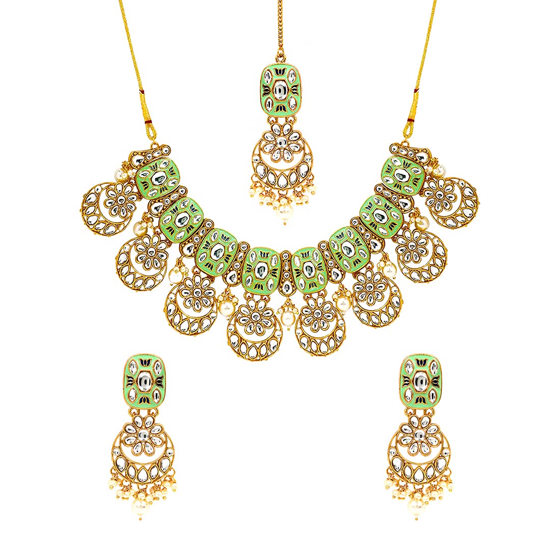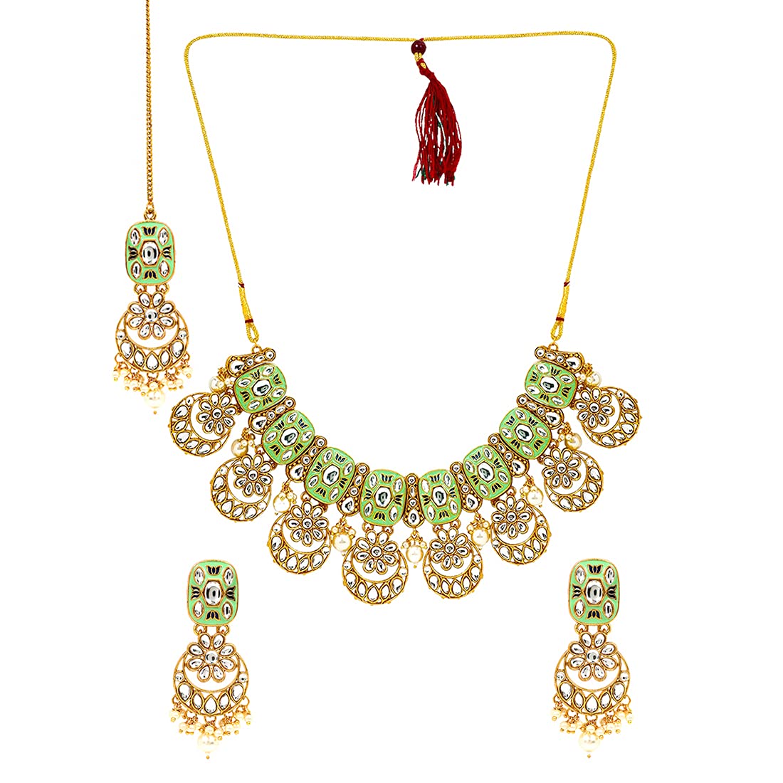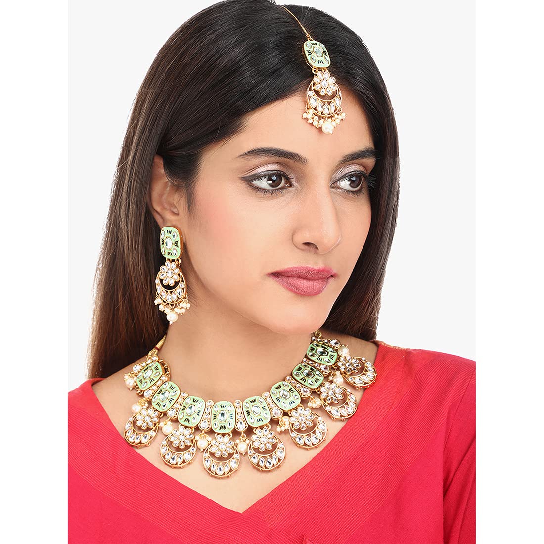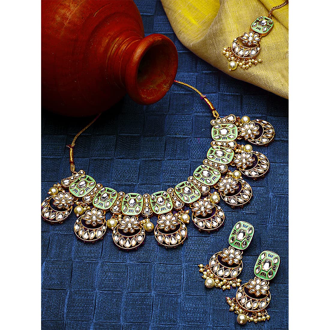 Yellow Chimes Traditional Jewellery Set for Women Kundan Green Beads Jewellery Set Ethnic Gold Plated Choker Necklace Set with Maang Tikka for Women and Girls.