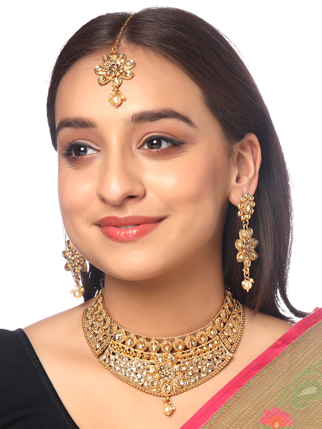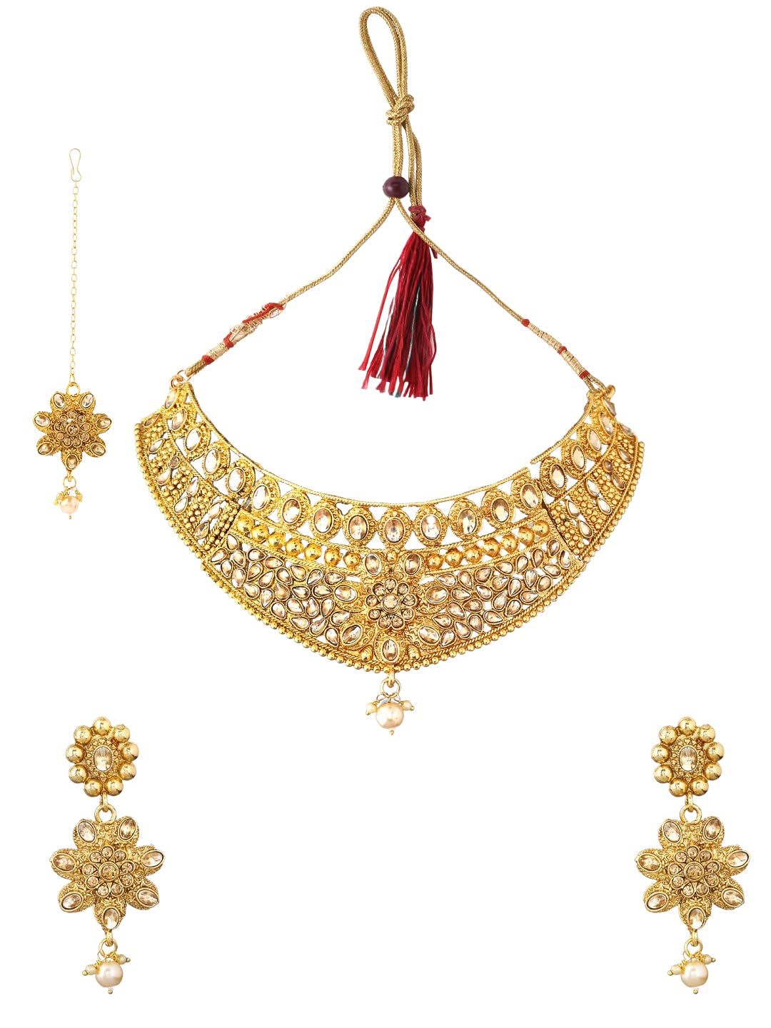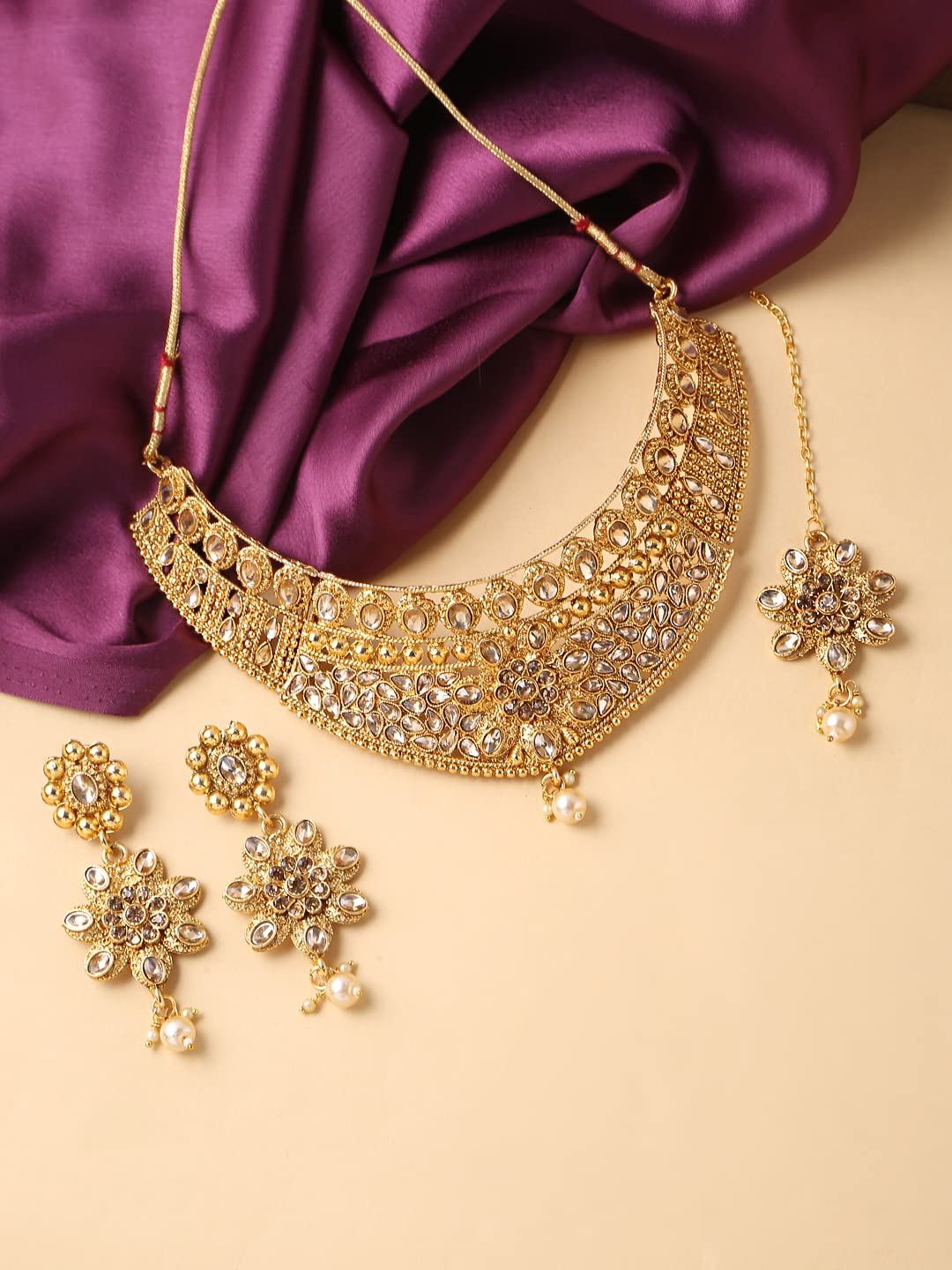 Yellow Chimes Traditional Jewellery Set for Women Gold-Plated Kundan Floral Choker Necklace Set With Maangtikka For Women and Girls