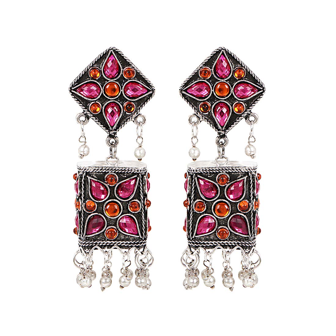 - Traditional Silver Oxidised Ethnic Pink Stone studded Jhumka Jhumki Earrings from Your Own Yellow Chimes. These Modern Looks Jhumka earrings will complement any Occasion Ethnic Wear as a Statement Piece.