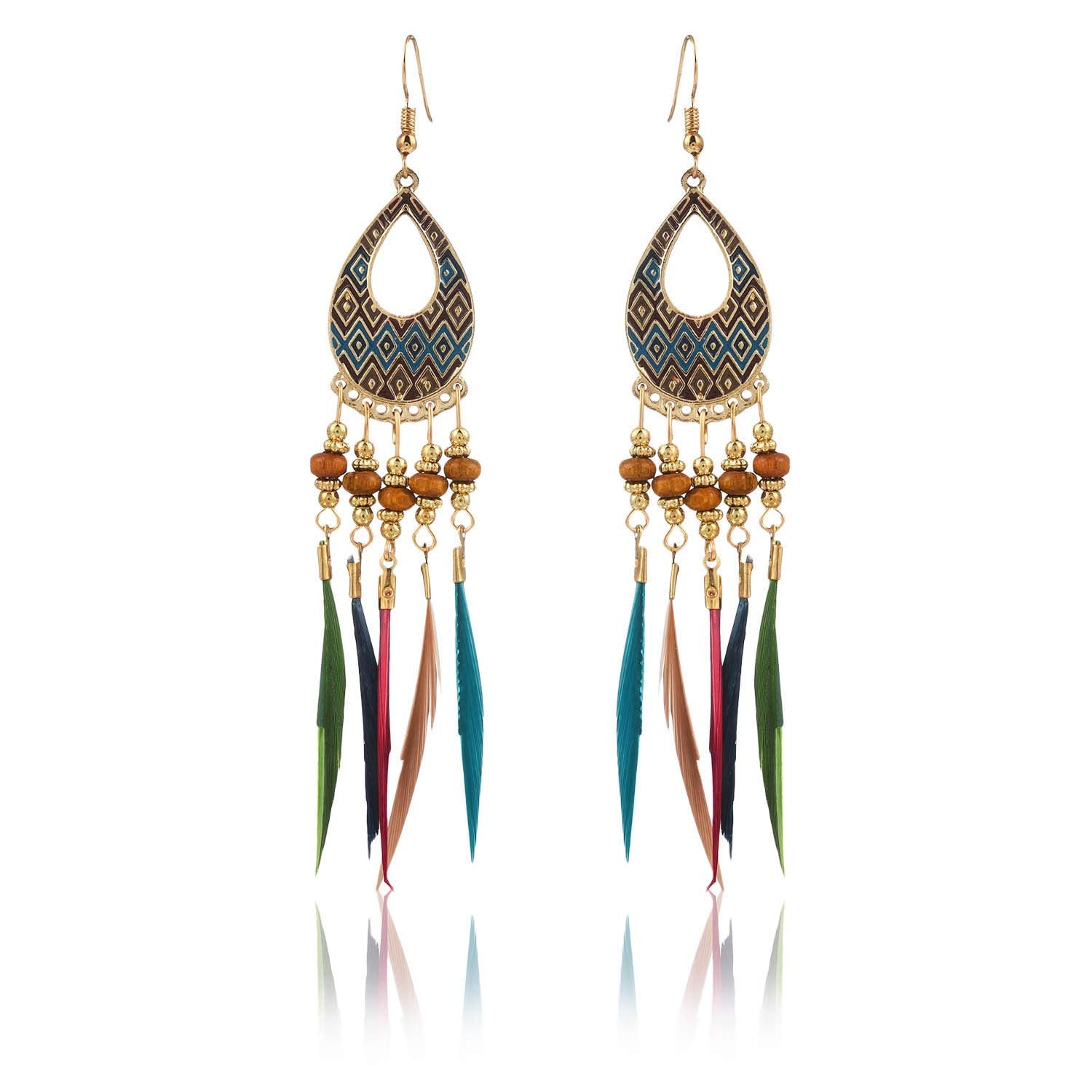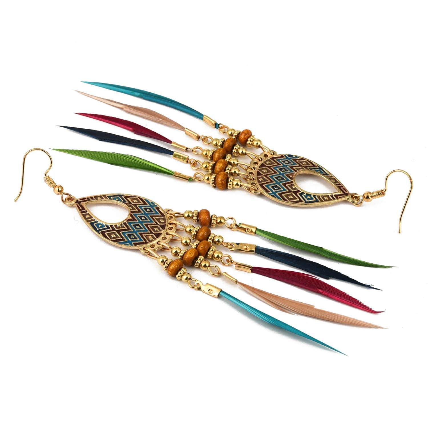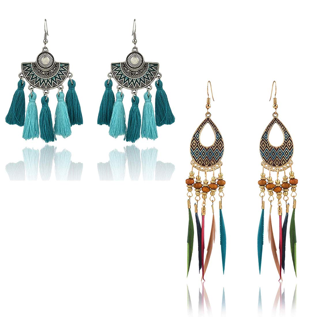 Yellow Chimes Two Pairs Feather Tassel Earrings For Women and Girls Combo of 2 Pairs Stylish Multicolor Feather Green Blue Tassel Earrings from Your Own Yellow Chimes. These designer earrings will complement any Occasion Formal/ Casual/ Party Wear Produced under Quality Control; One by One Checking; Focus on Detail Processing. Top Quality/ Latest Trend Design/Anti-Allergy Beautiful Looks at One Glance- with Intricate High Polish creates Glamorous Reflections and adds Luxurious Looks. Skin Friendly-: Lead & Nickel Free in compliance with all International Requirements , Size - 11 * 2 CM Gift for Her - Ideal Valentine, Birthday, Anniversary gift for someone you Love.