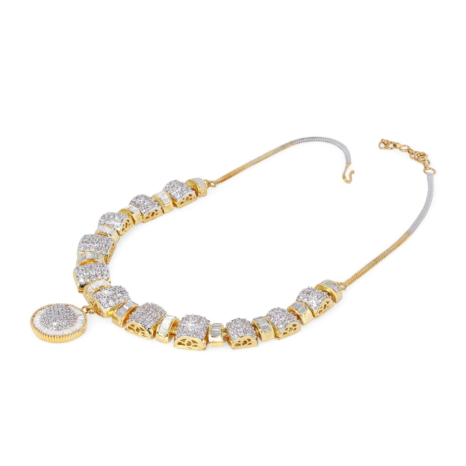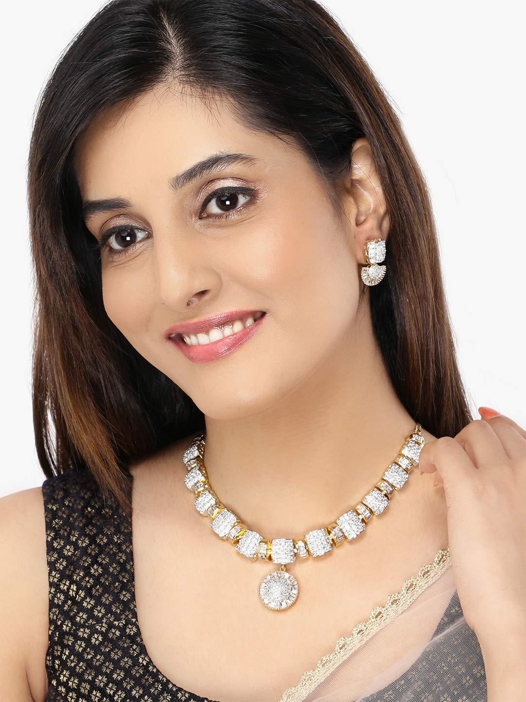- Elegant A lovely stylish pretty party wear designer contemporary piece,This gold plated choker necklace set with AD/Americal Diamond studded White necklace jewellery set A5 grade clarity is stunning and preciously suitable for all kinds of occasions.