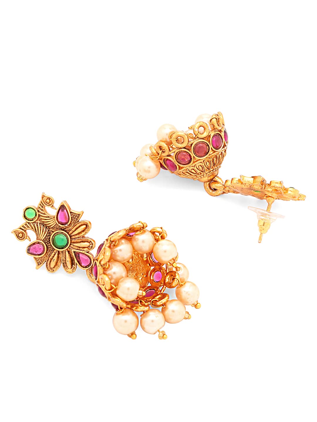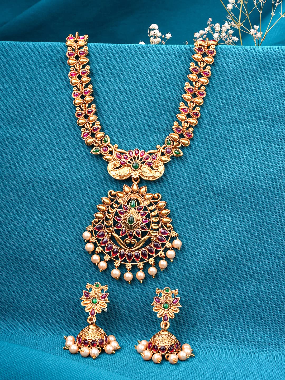 Women's Temple Traditional Gold Plated Studded Stone Antique Jewellery Necklace Set