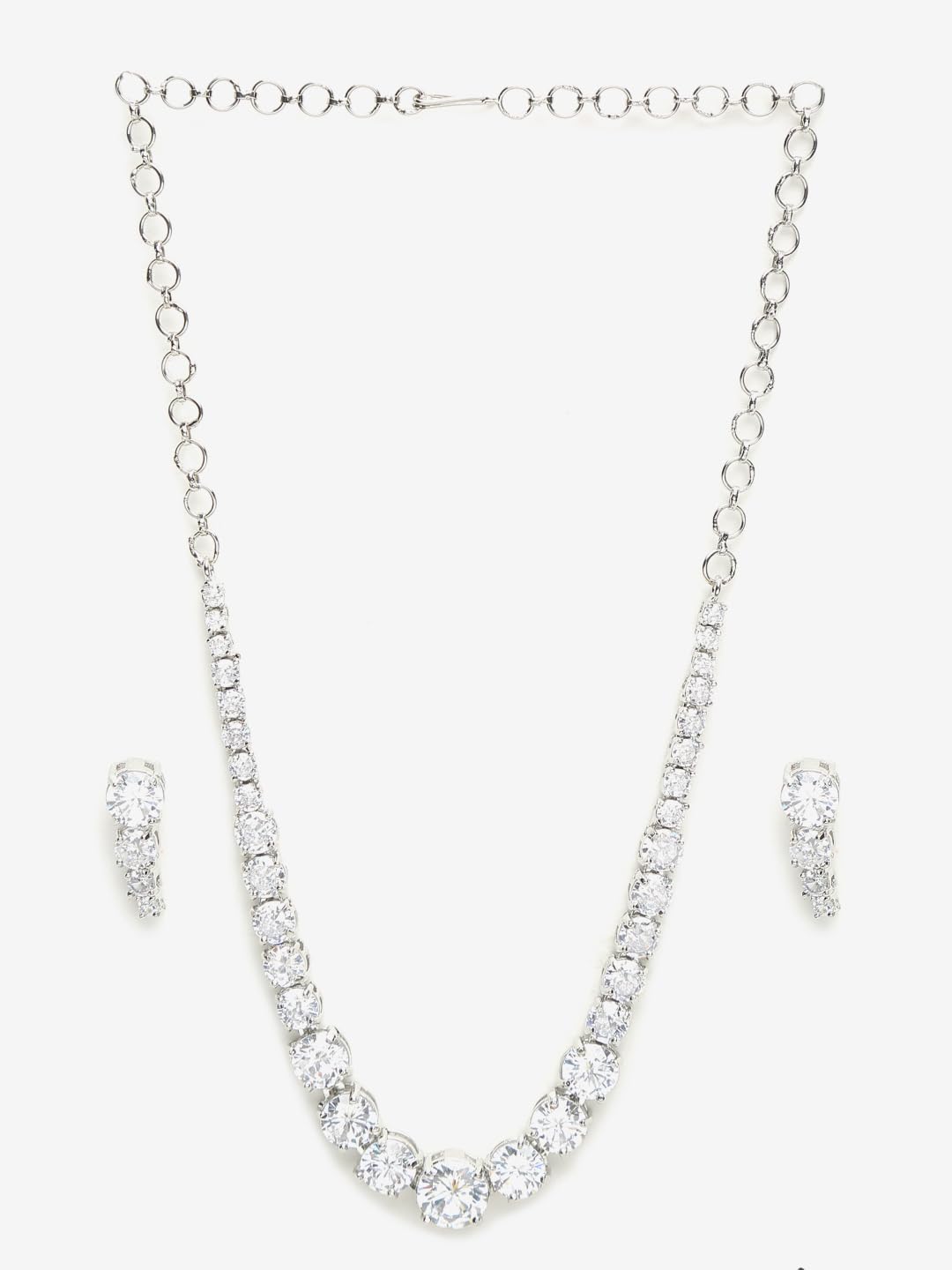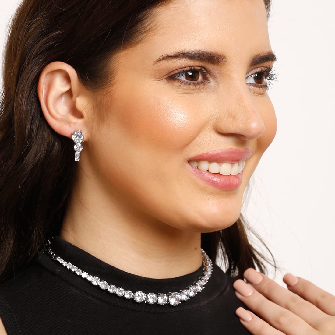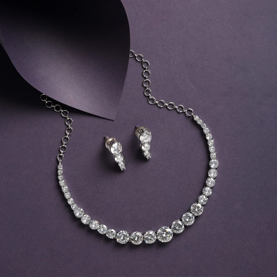 - Genuine Green American Diamond Necklace set for women is a classic piece that set itself distinct ad way apart, can light up the room solitarily with its sparkle.This Rhodium Plated AD Jewellery Set for Women with Drop Earrings A5 Grade clarity is Stunning & Preciously.Our Product is perfect for valentines Anniversary Birthday gift for Women,girlfriend,Wife.